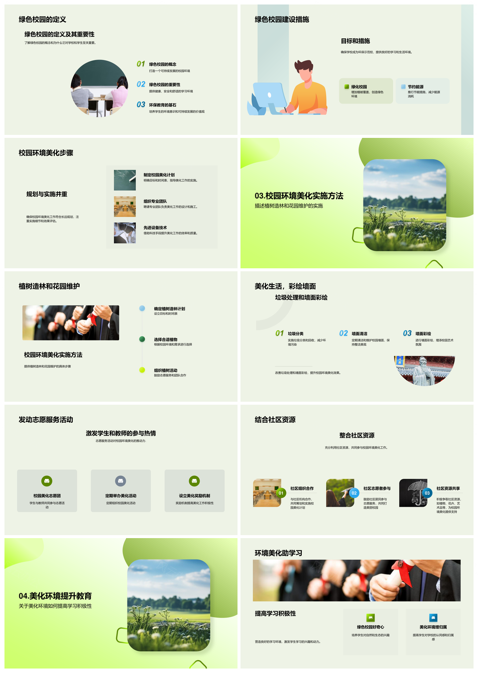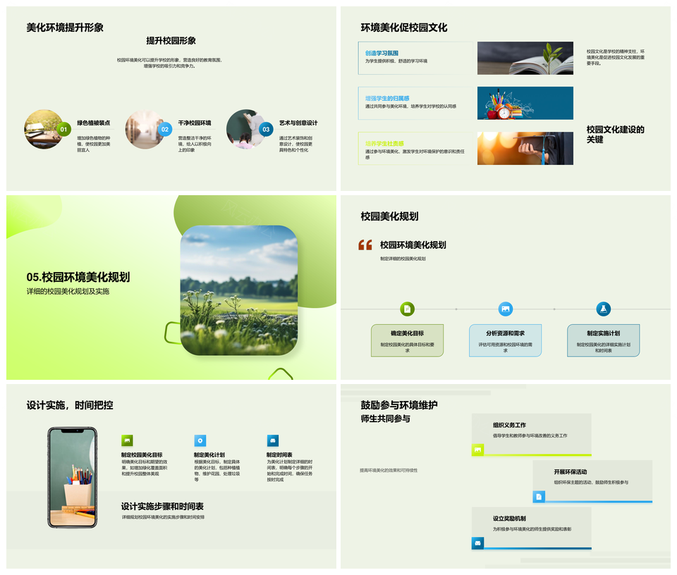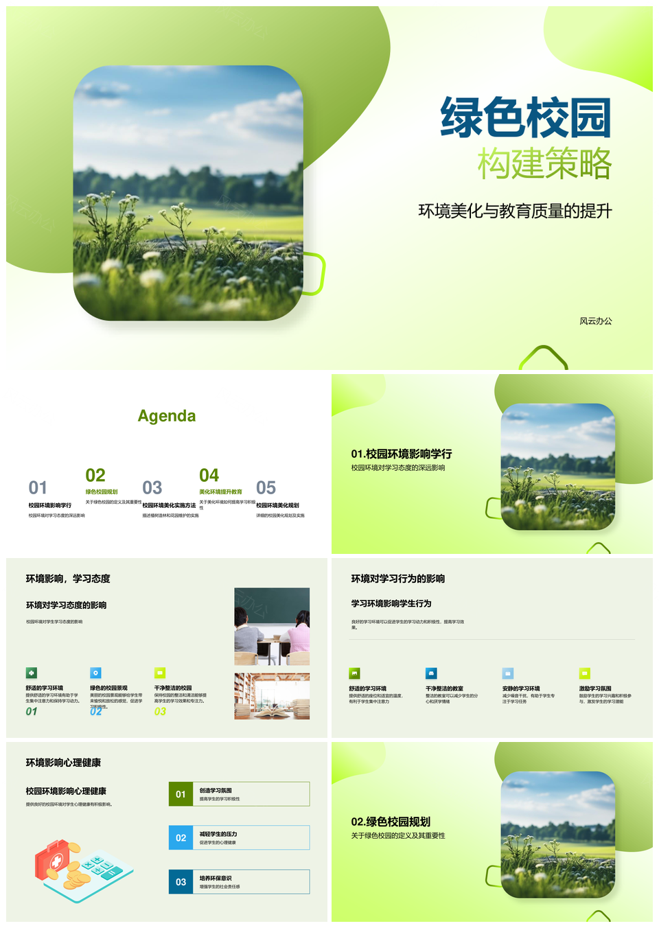 风云办公提供的绿色校园构建促教育学习与心理健康PPT模板,下载格式为pptx,一共24页,作品中文字及图均可以修改和编辑,图片更改请在作品中右键图片并更换,文字修改请直接点击文字进行修改。