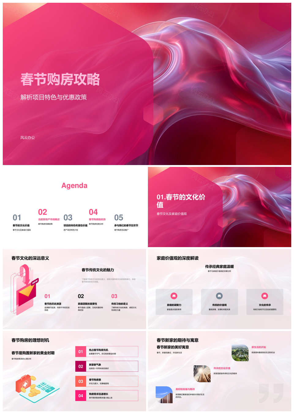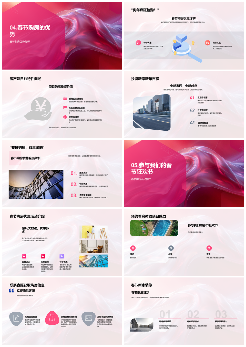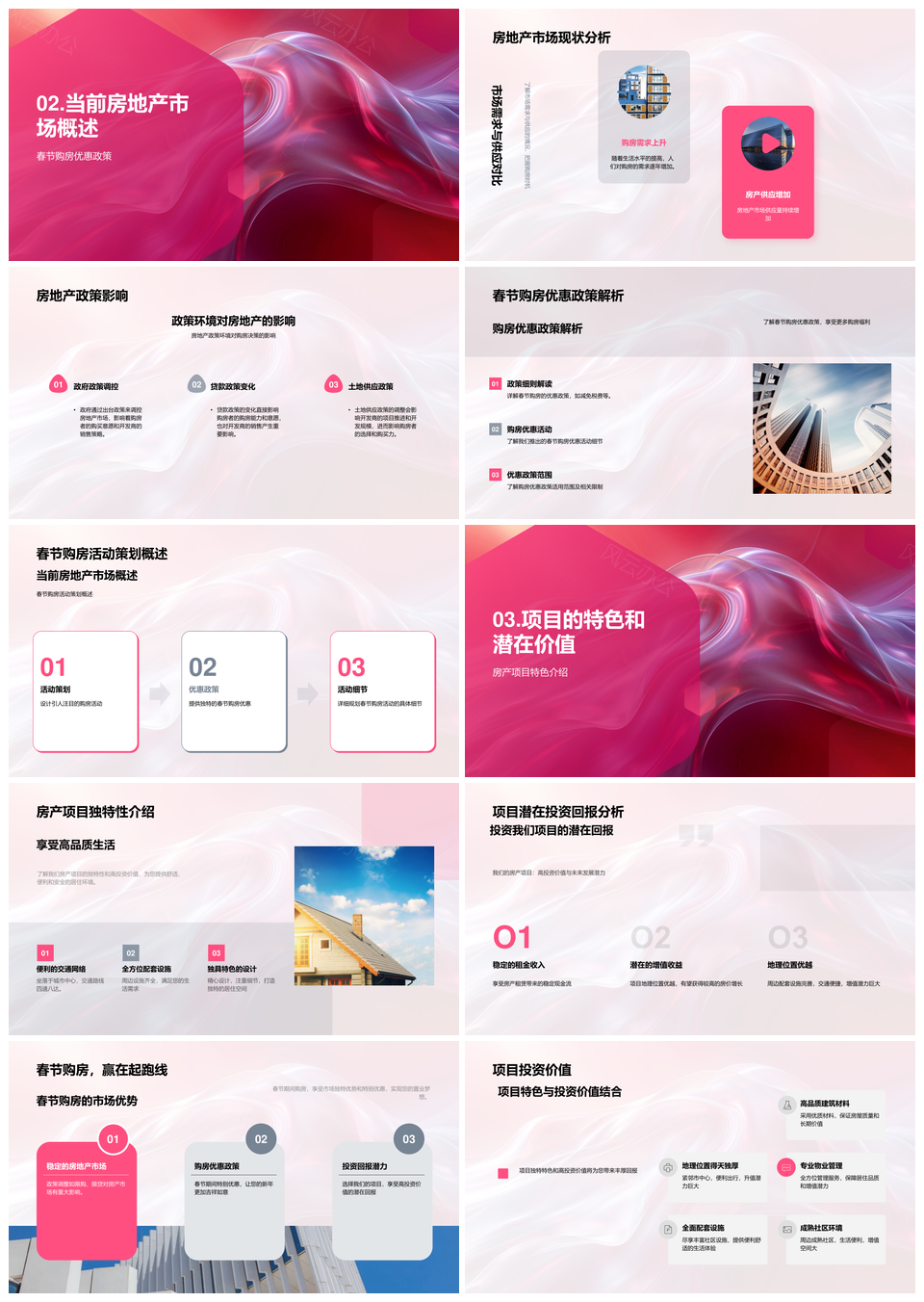 这是一张春节购房趋势政策优惠项目特色潜在回报PPT模板,包含春节、购房、趋势、政策、优惠、项目、特色、潜在、回报等主题内容,也可用作春节购房趋势政策优惠、购房趋势政策优惠项目、趋势政策优惠项目特色、政策优惠项目特色潜在、优惠项目特色潜在回报、春节购房政策优惠项目、购房政策优惠项目特色、政策优惠项目潜在回报、春节购房趋势政策、购房趋势政策优惠、趋势政策优惠项目、政策优惠项目特色、优惠项目特色潜在、项目特色潜在回报、春节购房优惠项目等PPT场景使用。 风云办公提供的春节购房趋势政策优惠项目特色潜在回报PPT模板,下载格式为pptx,一共28页,作品中文字及图均可以修改和编辑,图片更改请在作品中右键图片并更换,文字修改请直接点击文字进行修改。