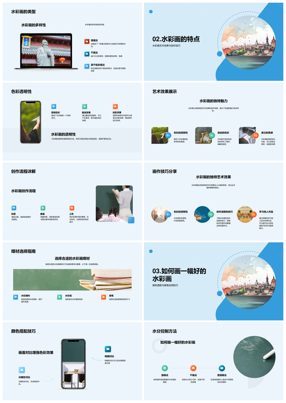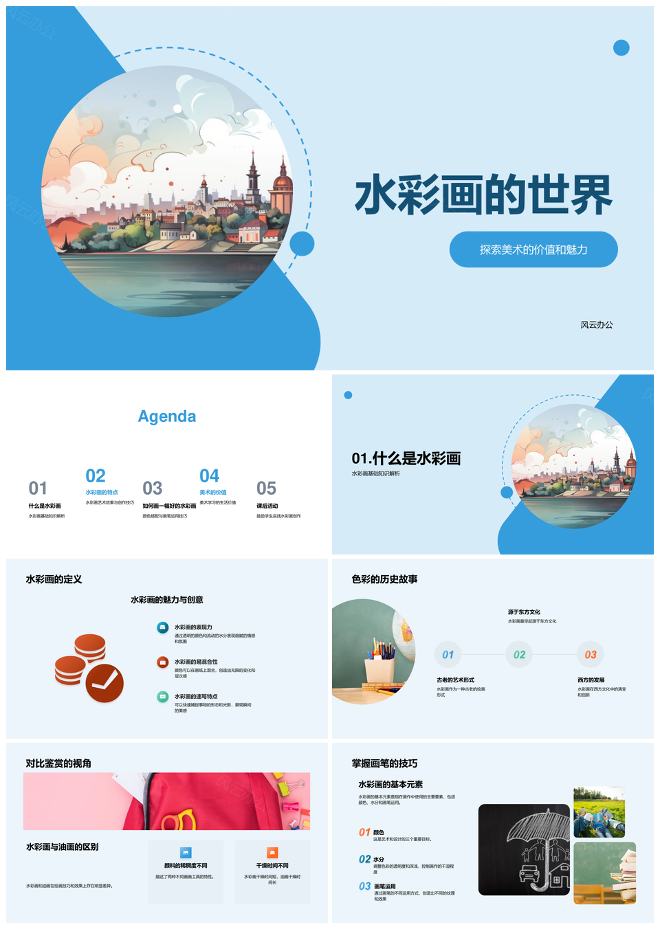 风云办公提供的水彩画技法调色实践与情感价值表达PPT模板,下载格式为pptx,一共33页,作品中文字及图均可以修改和编辑,图片更改请在作品中右键图片并更换,文字修改请直接点击文字进行修改。