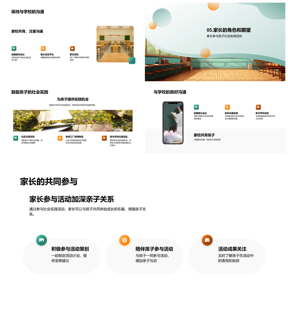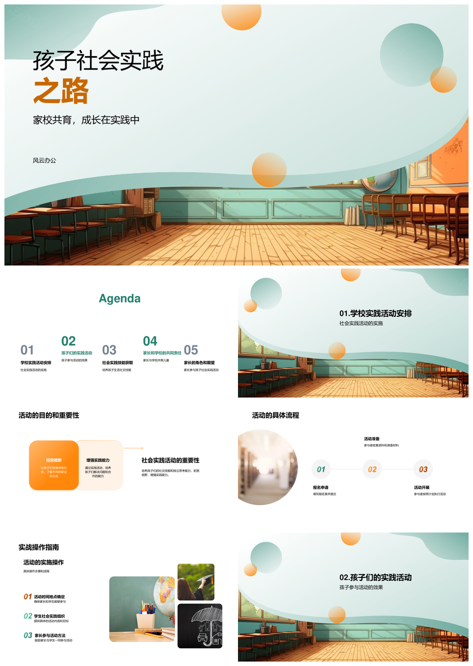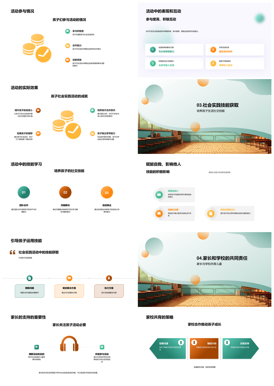 风云办公提供的家校共育三年级社会实践技能活动PPT模板,下载格式为pptx,一共23页,作品中文字及图均可以修改和编辑,图片更改请在作品中右键图片并更换,文字修改请直接点击文字进行修改。