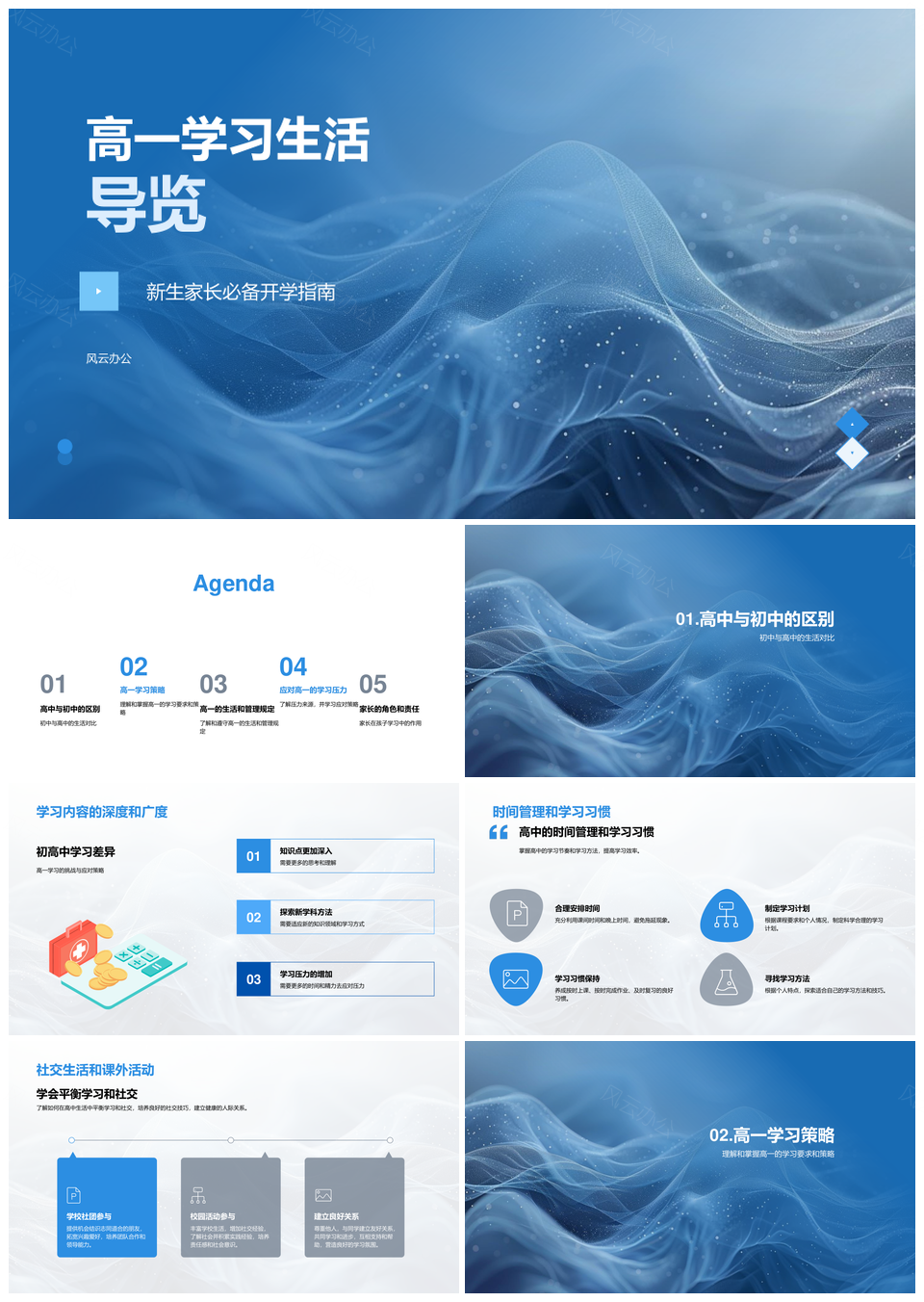 风云办公提供的高一新生学习生活家长指南PPT模板,下载格式为pptx,一共23页,作品中文字及图均可以修改和编辑,图片更改请在作品中右键图片并更换,文字修改请直接点击文字进行修改。