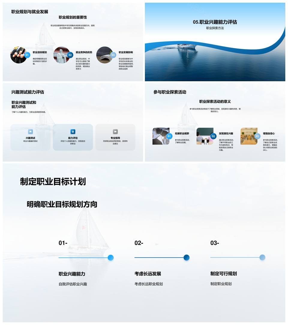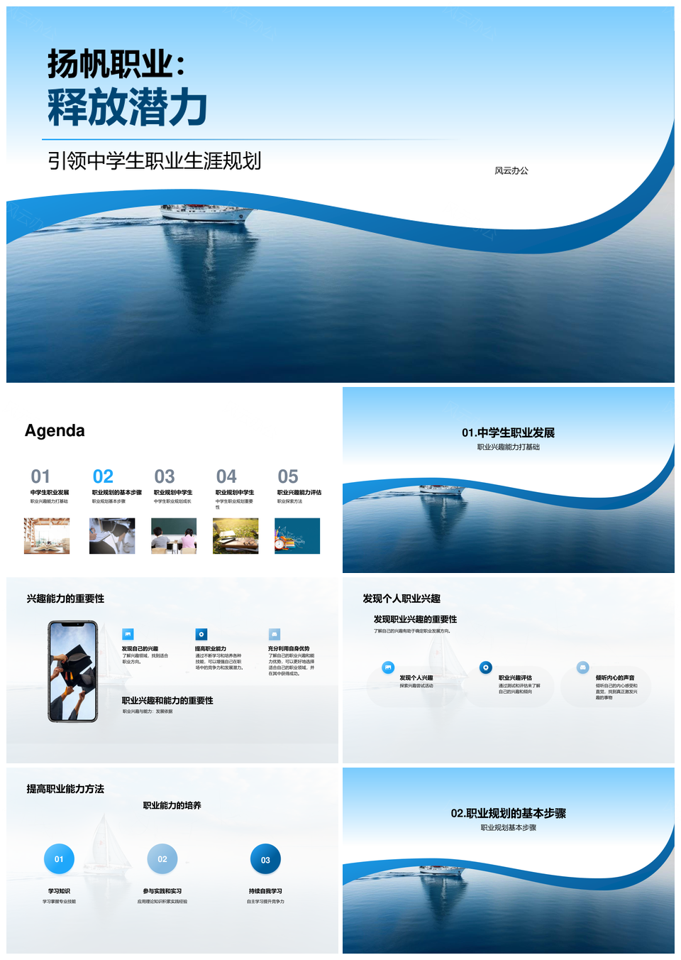 风云办公提供的中学生职业规划扬帆指导师启航PPT模板,下载格式为pptx,一共23页,作品中文字及图均可以修改和编辑,图片更改请在作品中右键图片并更换,文字修改请直接点击文字进行修改。