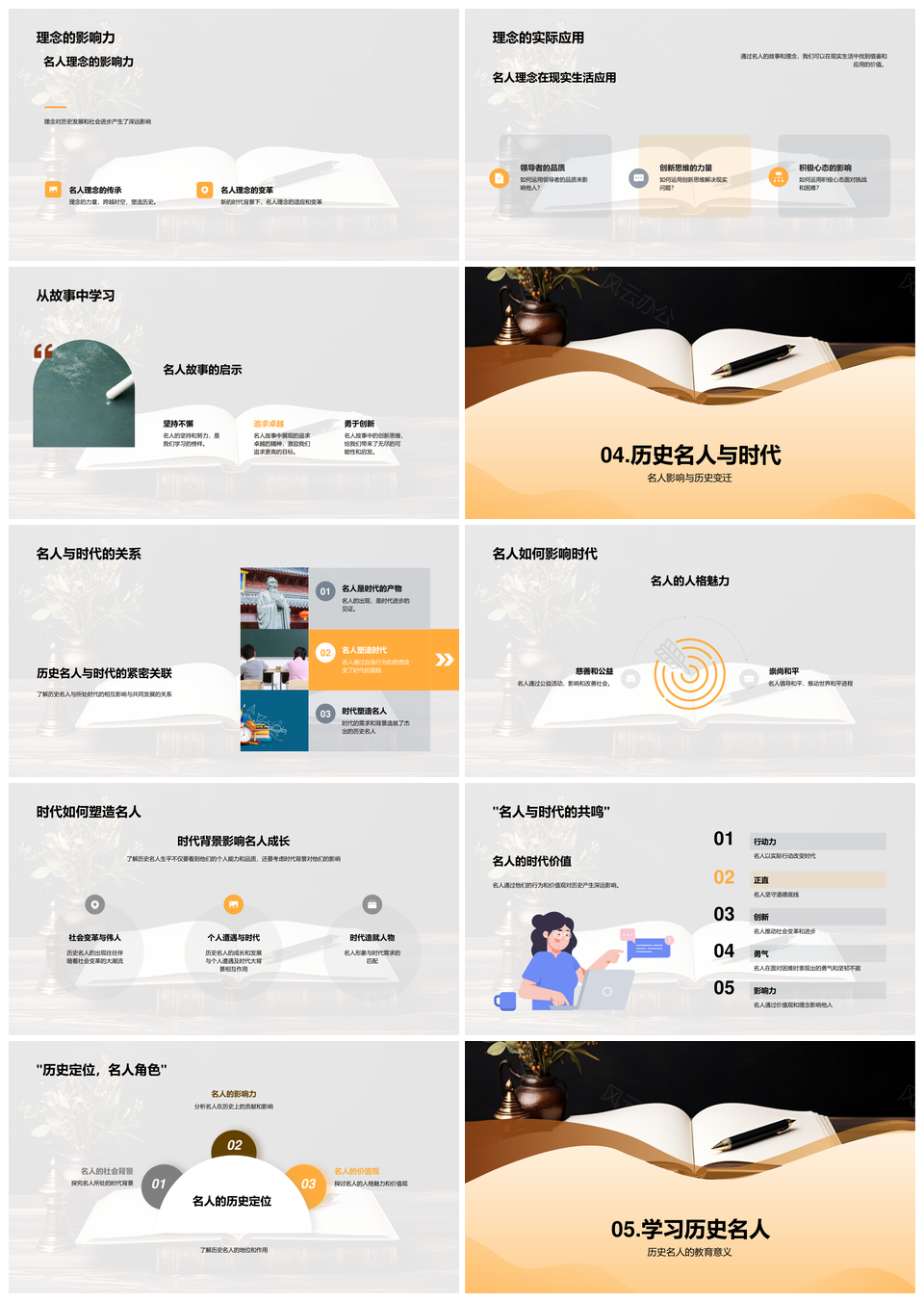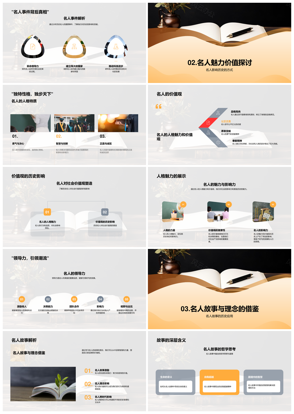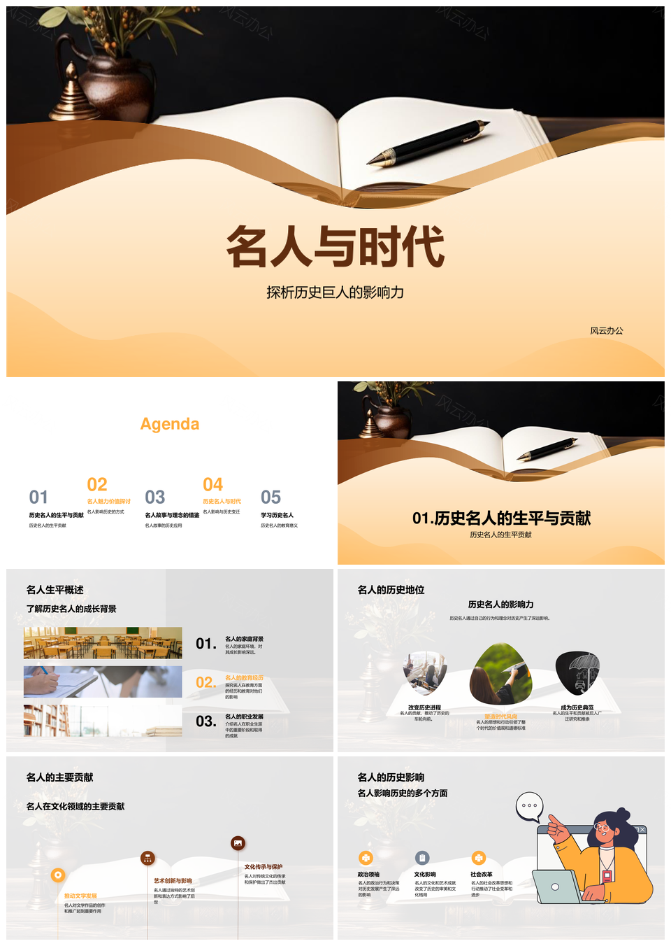 风云办公提供的历史名人价值观与魅力辉映时代PPT模板,下载格式为pptx,一共33页,作品中文字及图均可以修改和编辑,图片更改请在作品中右键图片并更换,文字修改请直接点击文字进行修改。