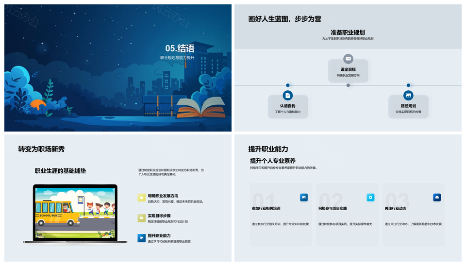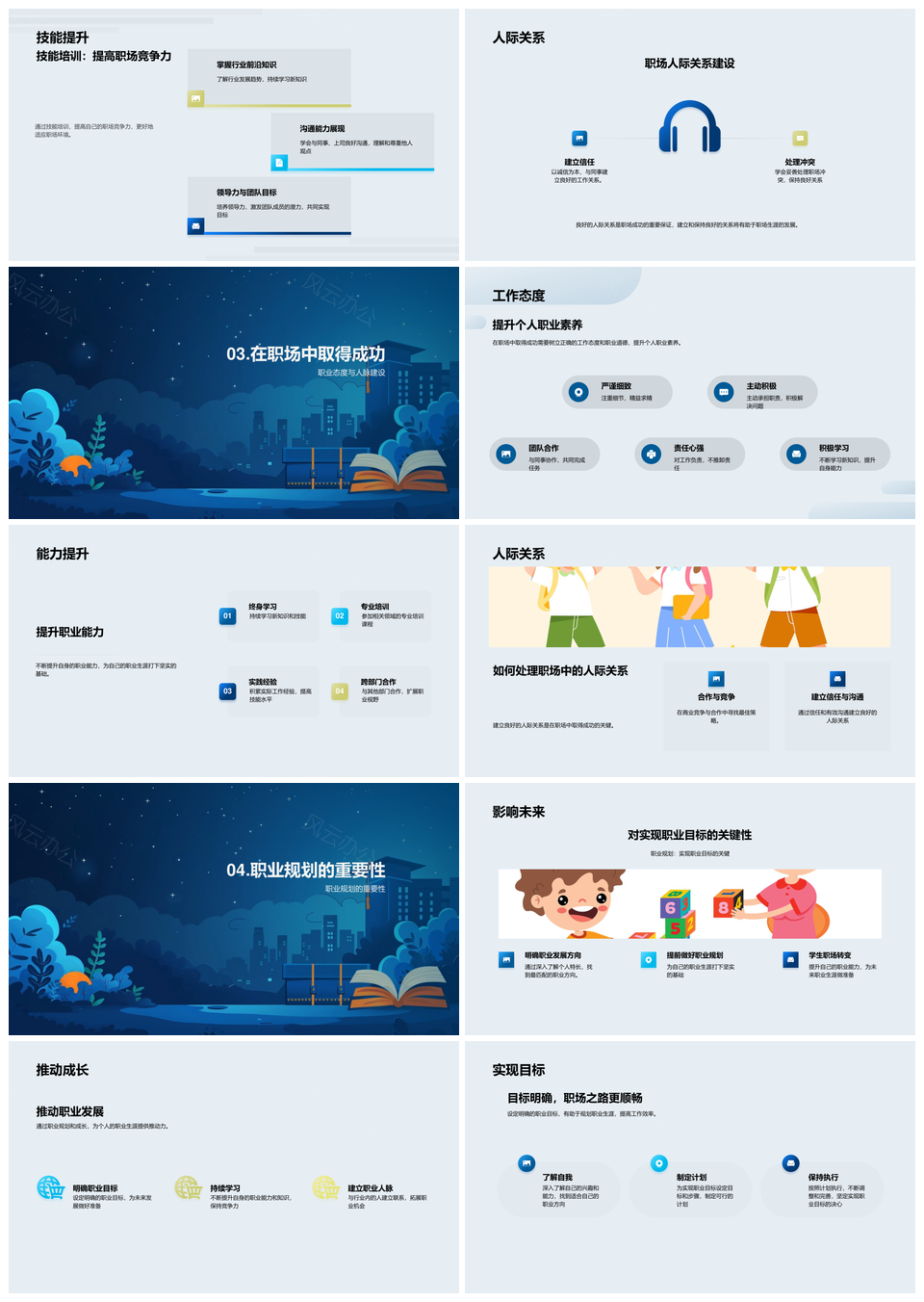 这是一张职业规划技能提升指引学生职场转型路径PPT模板,包含职业规划、技能提升、指引、学生、职场、转型、路径等主题内容,也可用作职业规划技能提升指引学生职场转型路径、技能提升指引学生职场转型路径、职业规划提升指引学生职场转型、职业规划技能提升职场转型路径、职业规划指引学生职场转型路径、技能提升学生职场转型路径、指引学生职场转型路径、职业规划技能提升指引学生、职业规划技能提升职场转型、技能提升指引职场转型路径、职业规划学生职场转型路径、提升指引学生职场转型、职业规划技能指引转型路径、技能学生职场转型路径、职场转型路径技能提升指引等PPT场景使用。 风云办公提供的职业规划技能提升指引学生职场转型路径PPT模板,下载格式为pptx,一共22页,作品中文字及图均可以修改和编辑,图片更改请在作品中右键图片并更换,文字修改请直接点击文字进行修改。