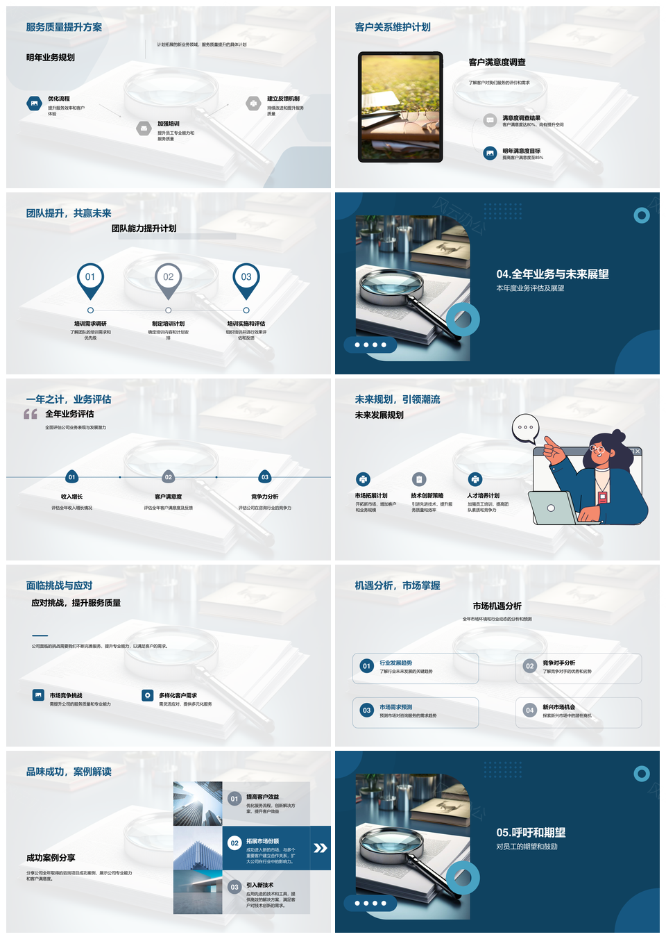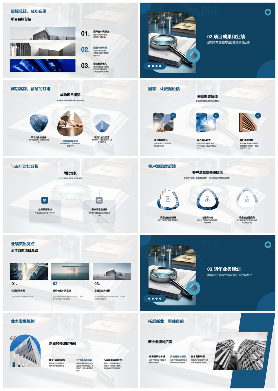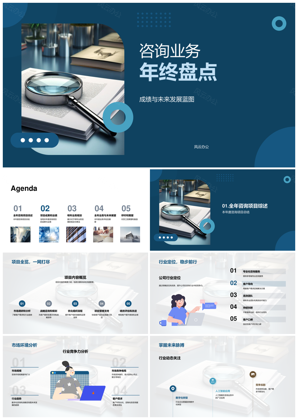 风云办公提供的咨询业务年终盘点成果与未来规划蓝图PPT模板,下载格式为pptx,一共33页,作品中文字及图均可以修改和编辑,图片更改请在作品中右键图片并更换,文字修改请直接点击文字进行修改。