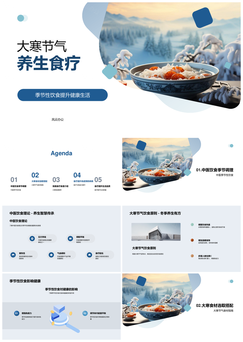 风云办公提供的大寒节气应季食补汤粥暖身增强免疫PPT模板,下载格式为pptx,一共23页,作品中文字及图均可以修改和编辑,图片更改请在作品中右键图片并更换,文字修改请直接点击文字进行修改。