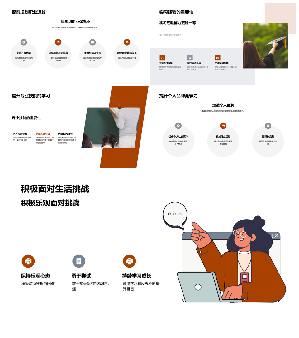 这是一张大学生求职规划专业实习品牌毕业准备之路PPT模板,包含大学生、求职、规划、专业、实习、品牌、毕业、准备、之路等主题内容,也可用作大学生求职规划专业实习、求职规划专业实习品牌、规划专业实习品牌毕业、专业实习品牌毕业准备、实习品牌毕业准备、大学生求职规划专业、求职规划专业实习、规划专业实习品牌、专业实习品牌毕业、实习品牌毕业准备、大学生求职规划、求职规划专业、规划专业实习、专业实习品牌、实习品牌毕业等PPT场景使用。 风云办公提供的大学生求职规划专业实习品牌毕业准备之路PPT模板,下载格式为pptx,一共33页,作品中文字及图均可以修改和编辑,图片更改请在作品中右键图片并更换,文字修改请直接点击文字进行修改。