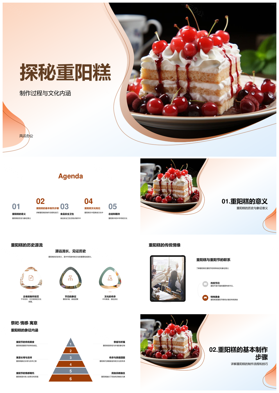 风云办公提供的重阳糕制作技艺文化内涵与象征探秘PPT模板,下载格式为pptx,一共23页,作品中文字及图均可以修改和编辑,图片更改请在作品中右键图片并更换,文字修改请直接点击文字进行修改。