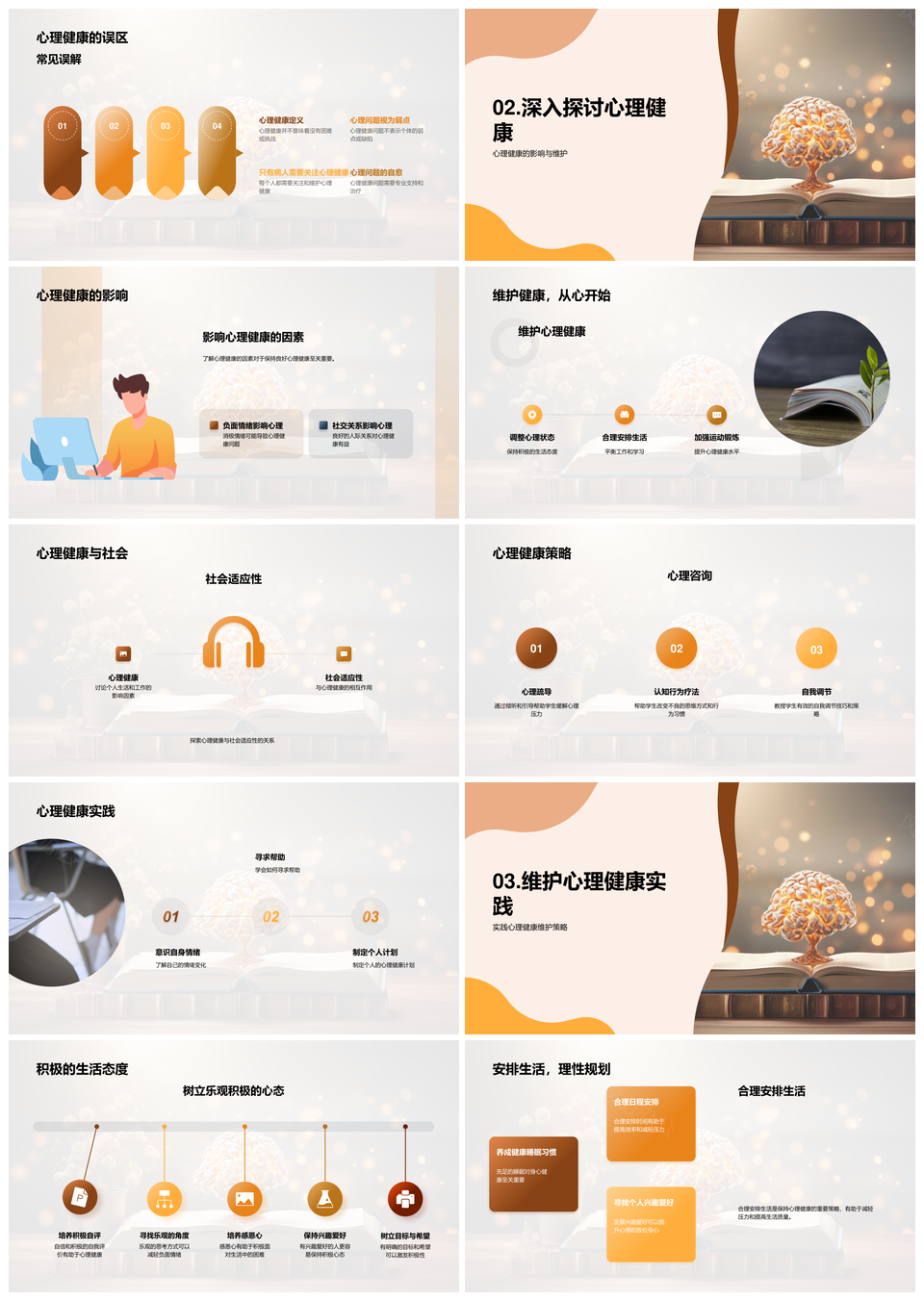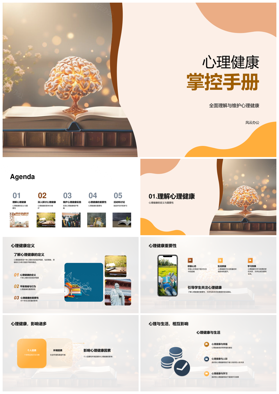 风云办公提供的心理健康守护生活态度社会适应手册PPT模板,下载格式为pptx,一共33页,作品中文字及图均可以修改和编辑,图片更改请在作品中右键图片并更换,文字修改请直接点击文字进行修改。