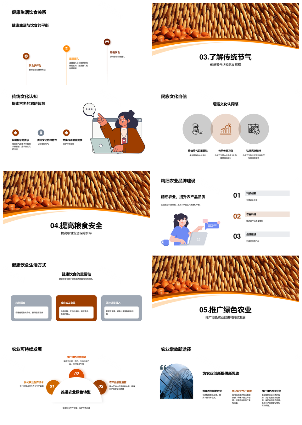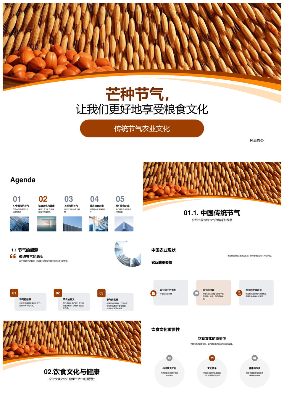 风云办公提供的芒种传承粮食文化弘扬传统农耕健康PPT模板,下载格式为pptx,一共18页,作品中文字及图均可以修改和编辑,图片更改请在作品中右键图片并更换,文字修改请直接点击文字进行修改。