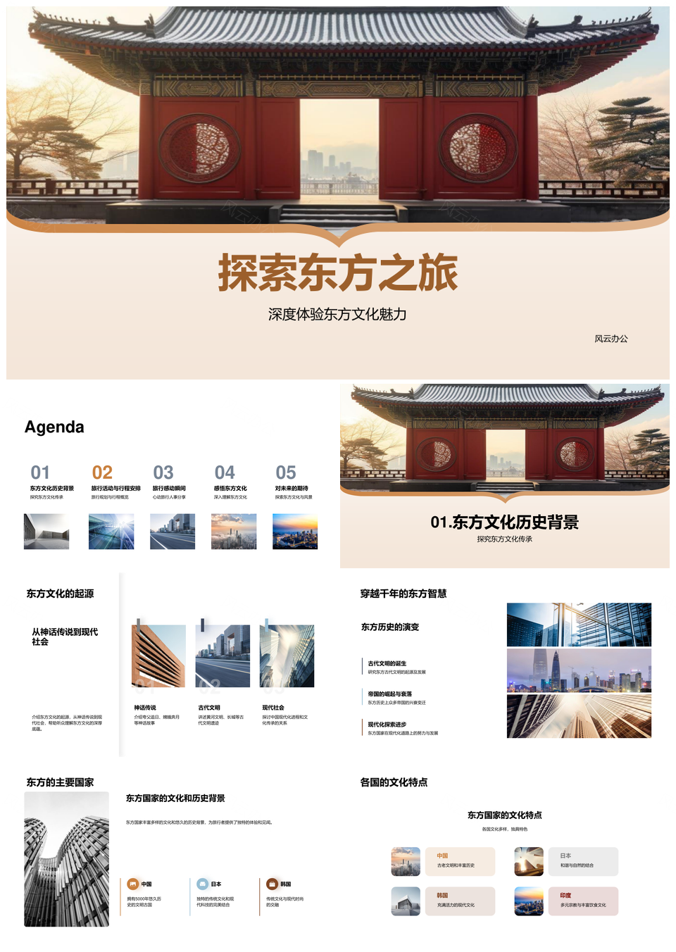 风云办公提供的东方古国文化历史寺庙探索之旅PPT模板,下载格式为pptx,一共24页,作品中文字及图均可以修改和编辑,图片更改请在作品中右键图片并更换,文字修改请直接点击文字进行修改。