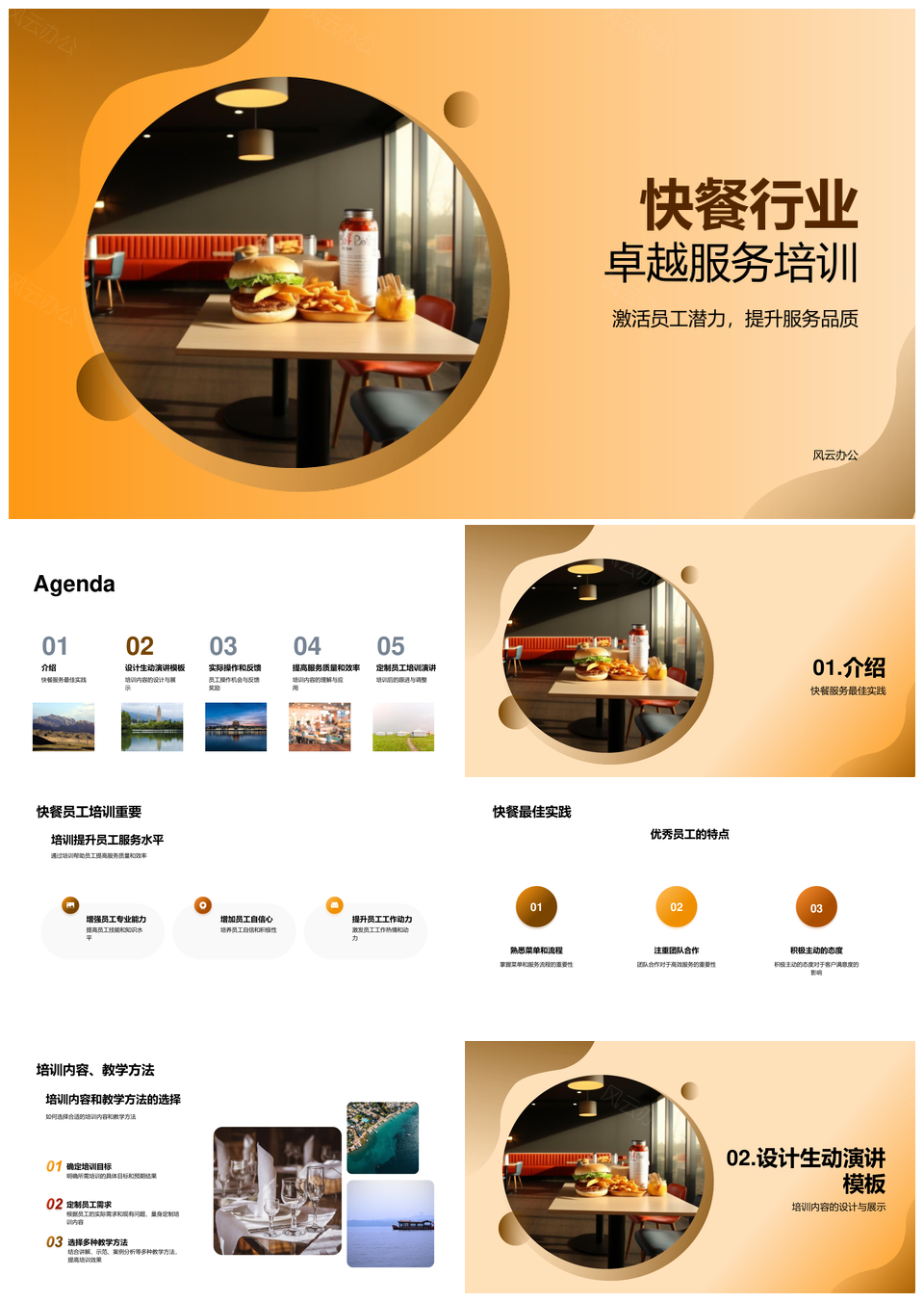 风云办公提供的快餐连锁员工服务质量培训PPT模板,下载格式为pptx,一共23页,作品中文字及图均可以修改和编辑,图片更改请在作品中右键图片并更换,文字修改请直接点击文字进行修改。