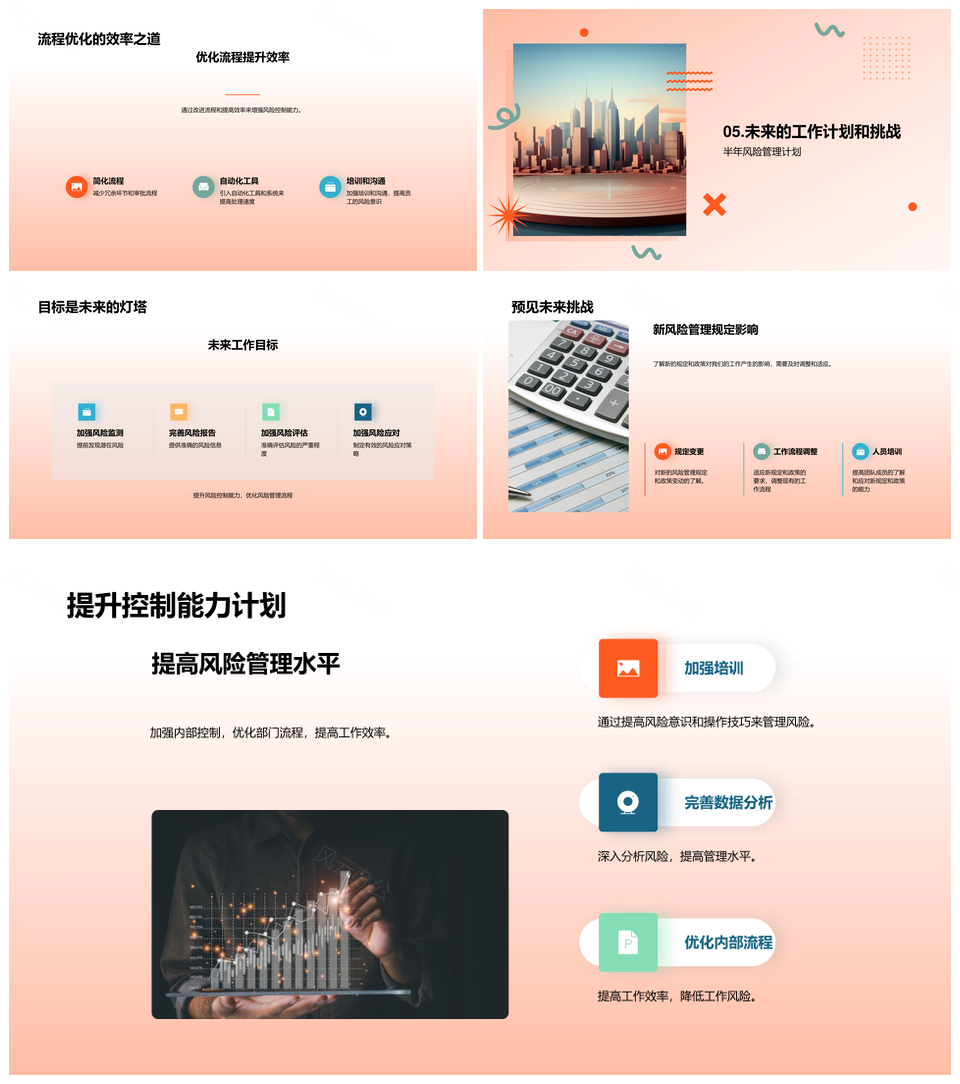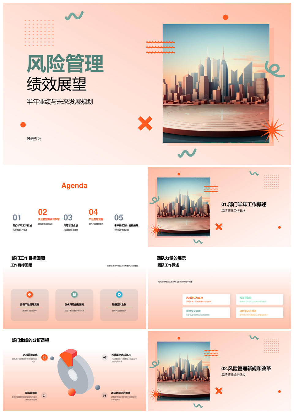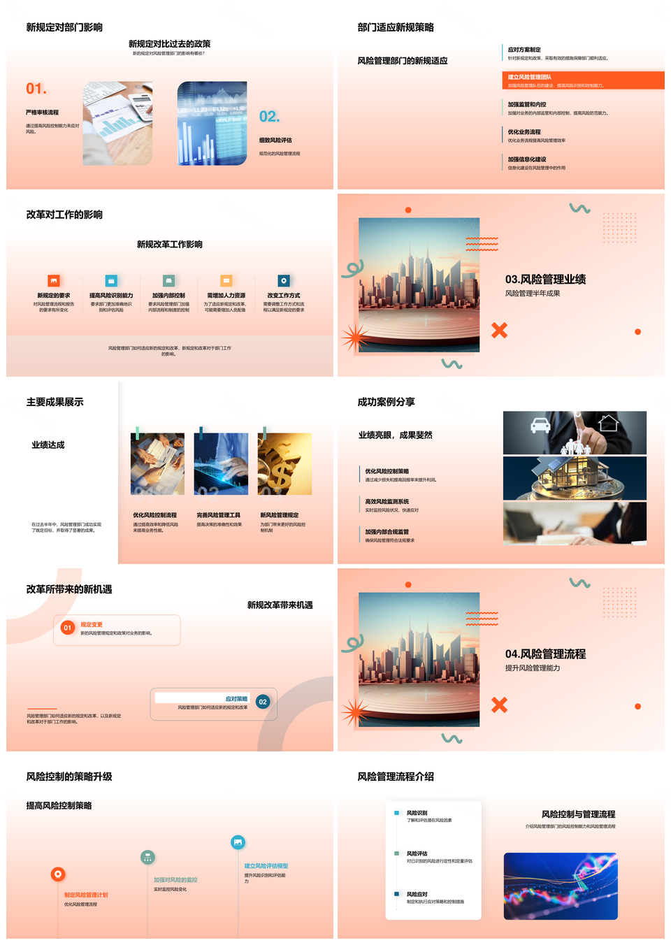 风云办公提供的风险管理业绩未来规划与风控改革PPT模板,下载格式为pptx,一共23页,作品中文字及图均可以修改和编辑,图片更改请在作品中右键图片并更换,文字修改请直接点击文字进行修改。