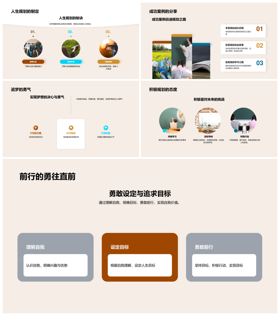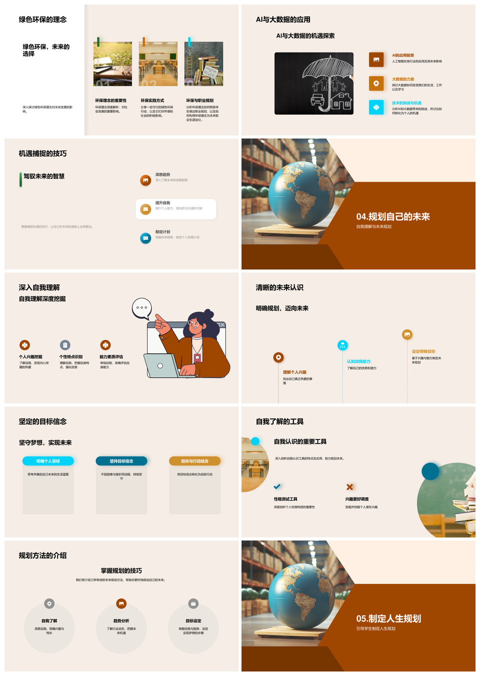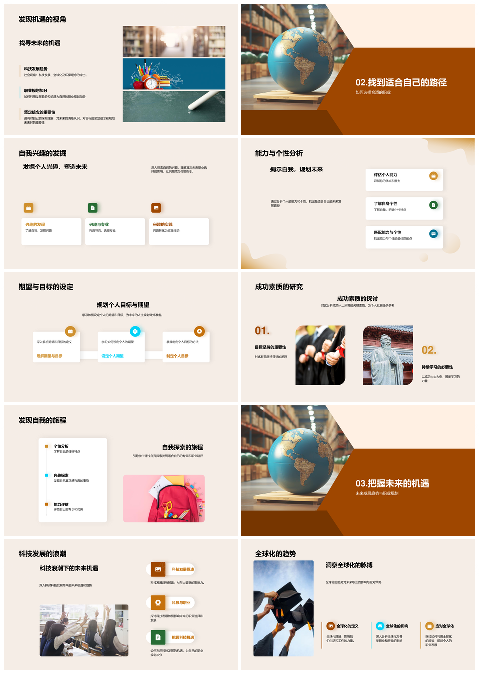 这是一张职业人生规划未来趋势成就自我教育兴趣PPT模板,包含职业、人生规划、未来趋势、成就、自我、教育、兴趣等主题内容,也可用作职业人生规划未来、人生规划未来趋势、规划未来趋势成就、未来趋势成就自我、趋势成就自我教育、成就自我教育兴趣、职业规划未来趋势、人生规划成就自我、职业人生规划、人生规划未来、规划未来趋势、未来趋势成就、趋势成就自我、成就自我教育、自我教育兴趣等PPT场景使用。 风云办公提供的职业人生规划未来趋势成就自我教育兴趣PPT模板,下载格式为pptx,一共33页,作品中文字及图均可以修改和编辑,图片更改请在作品中右键图片并更换,文字修改请直接点击文字进行修改。
