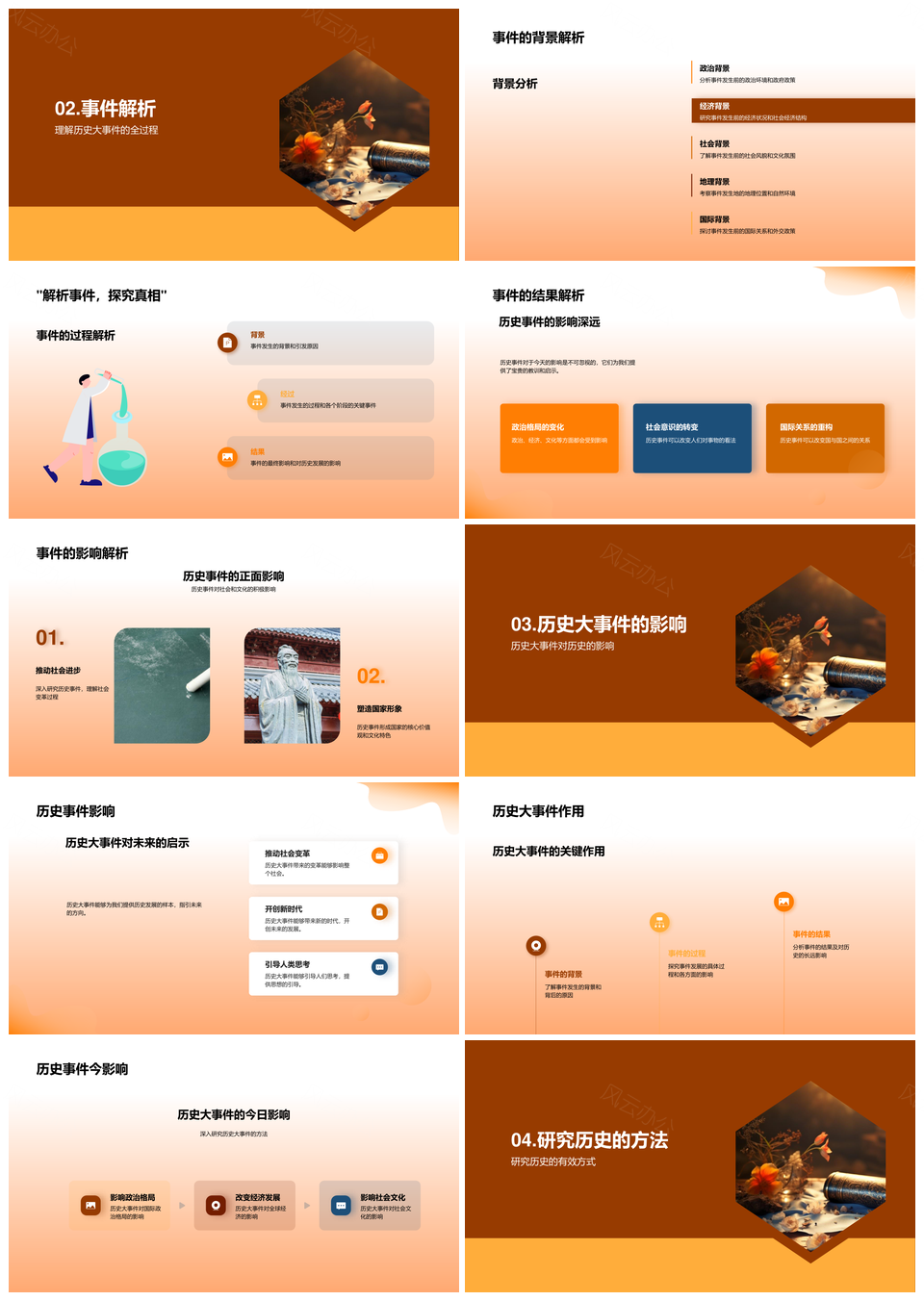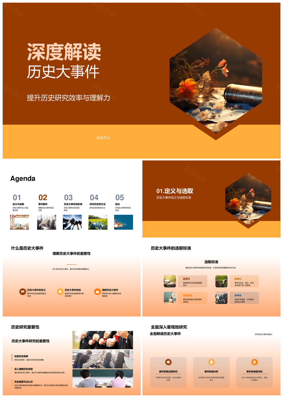 风云办公提供的历史大事件研究思维与古老卷轴解析PPT模板,下载格式为pptx,一共25页,作品中文字及图均可以修改和编辑,图片更改请在作品中右键图片并更换,文字修改请直接点击文字进行修改。