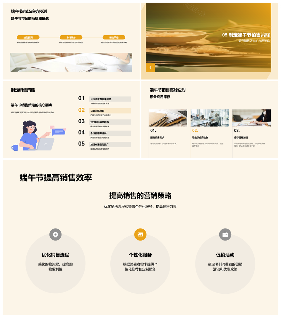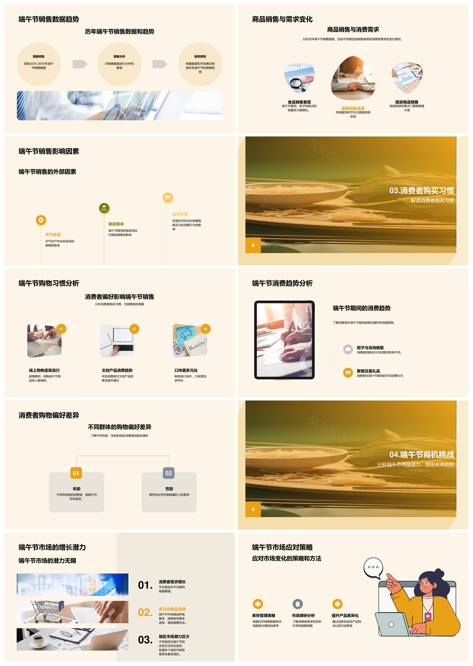 风云办公提供的端午节市场消费趋势策略数据全解析PPT模板,下载格式为pptx,一共23页,作品中文字及图均可以修改和编辑,图片更改请在作品中右键图片并更换,文字修改请直接点击文字进行修改。