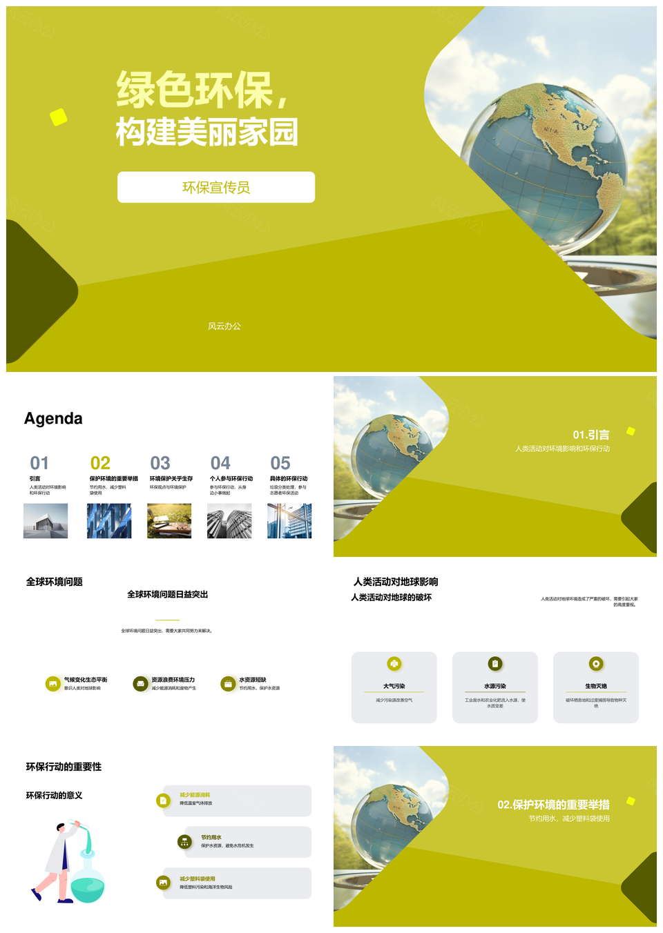 风云办公提供的绿色环保行动守护地球共建美丽家园PPT模板,下载格式为pptx,一共21页,作品中文字及图均可以修改和编辑,图片更改请在作品中右键图片并更换,文字修改请直接点击文字进行修改。