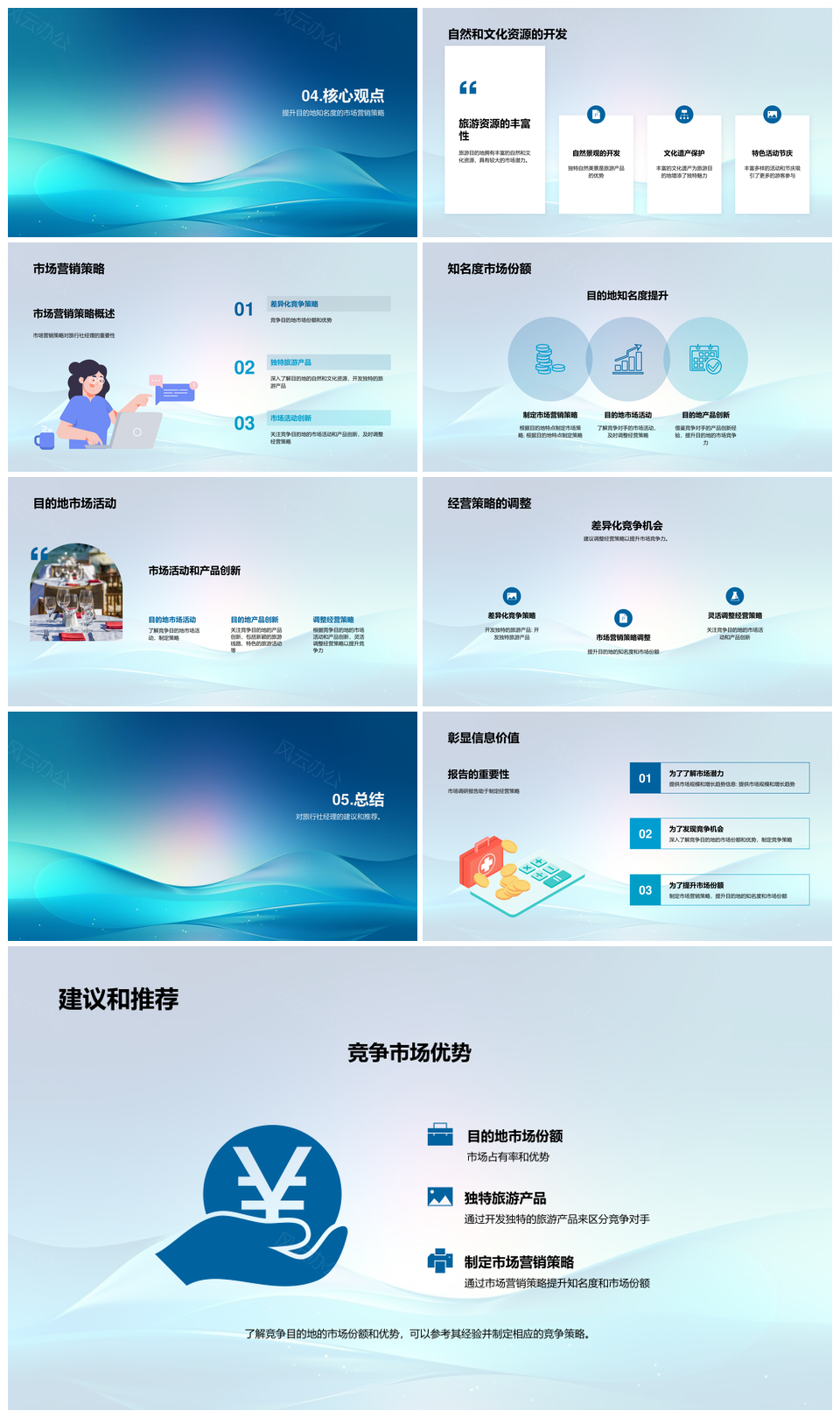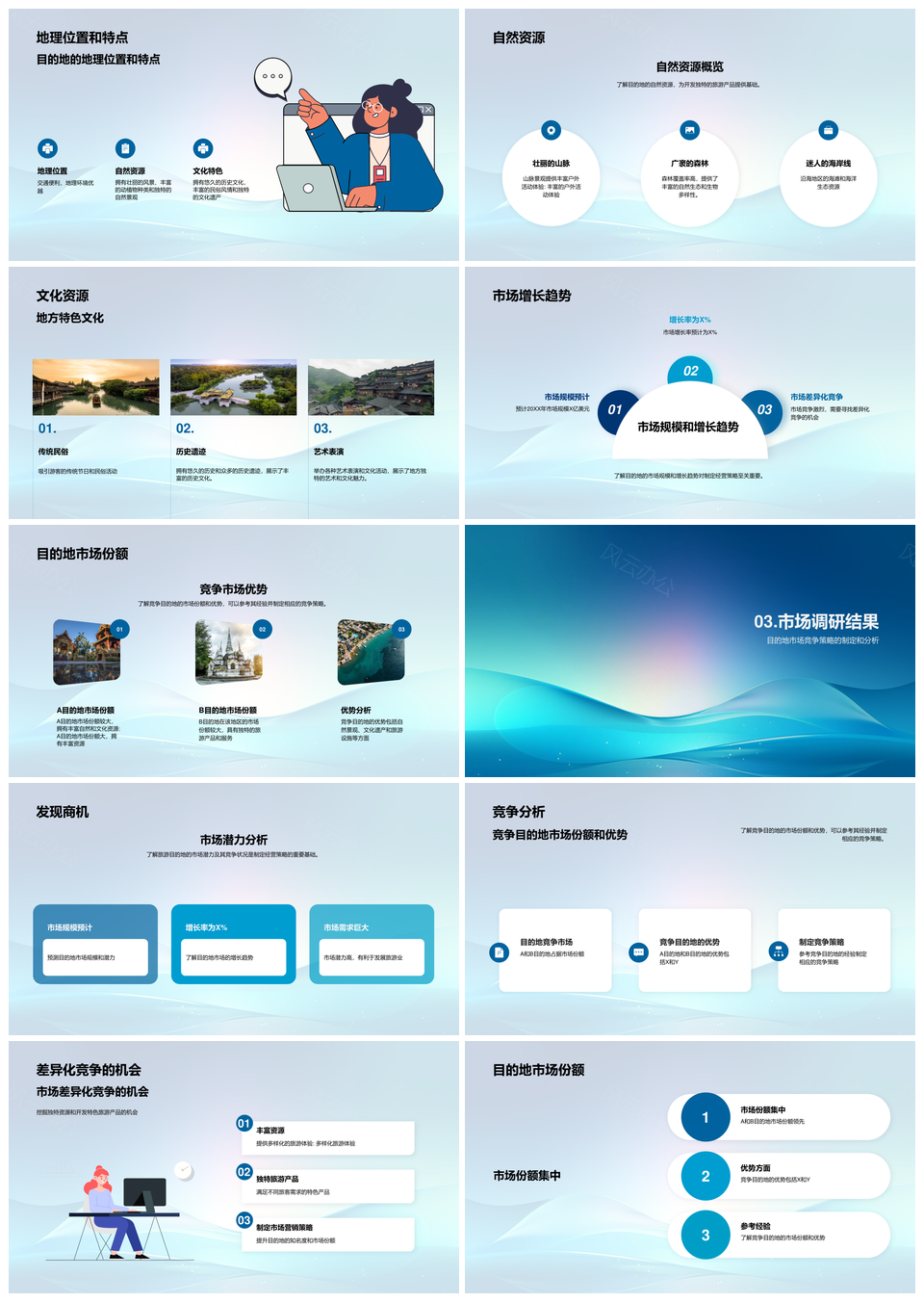 这是一张旅游目的地市场调研PPT模板,包含旅游目的地、市场、调研等主题内容,也可用作旅游目的地市场调研、旅游目的地市场、旅游目的地调研、目的地市场调研、旅游市场调研、旅游目的地、旅游市场、旅游调研、目的地市场、目的地调研、市场调研、调研目的地、目的地旅游市场、调研旅游、目的地旅游等PPT场景使用。 风云办公提供的旅游目的地市场调研PPT模板,下载格式为pptx,一共27页,作品中文字及图均可以修改和编辑,图片更改请在作品中右键图片并更换,文字修改请直接点击文字进行修改。