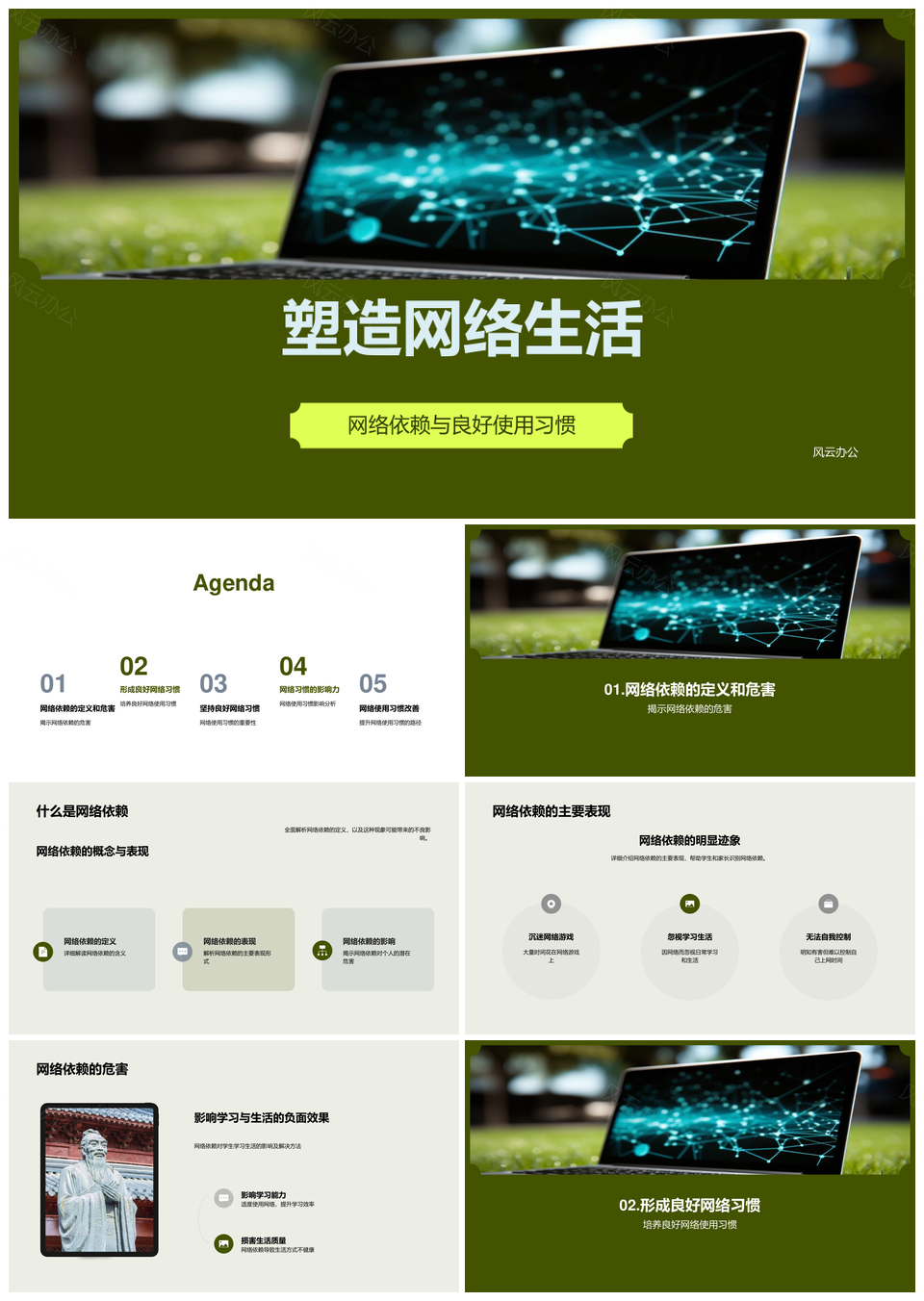 风云办公提供的家校共育网络行为习惯防依赖危害PPT模板,下载格式为pptx,一共23页,作品中文字及图均可以修改和编辑,图片更改请在作品中右键图片并更换,文字修改请直接点击文字进行修改。