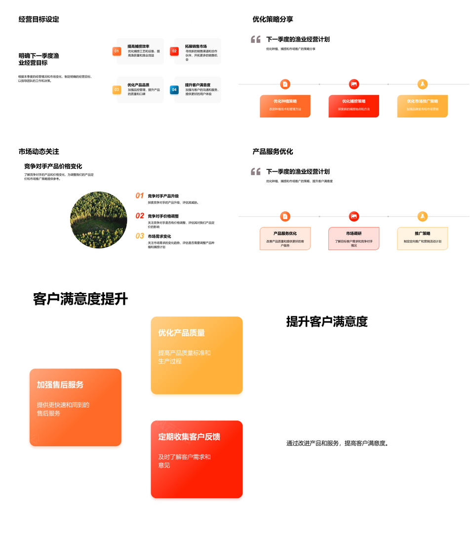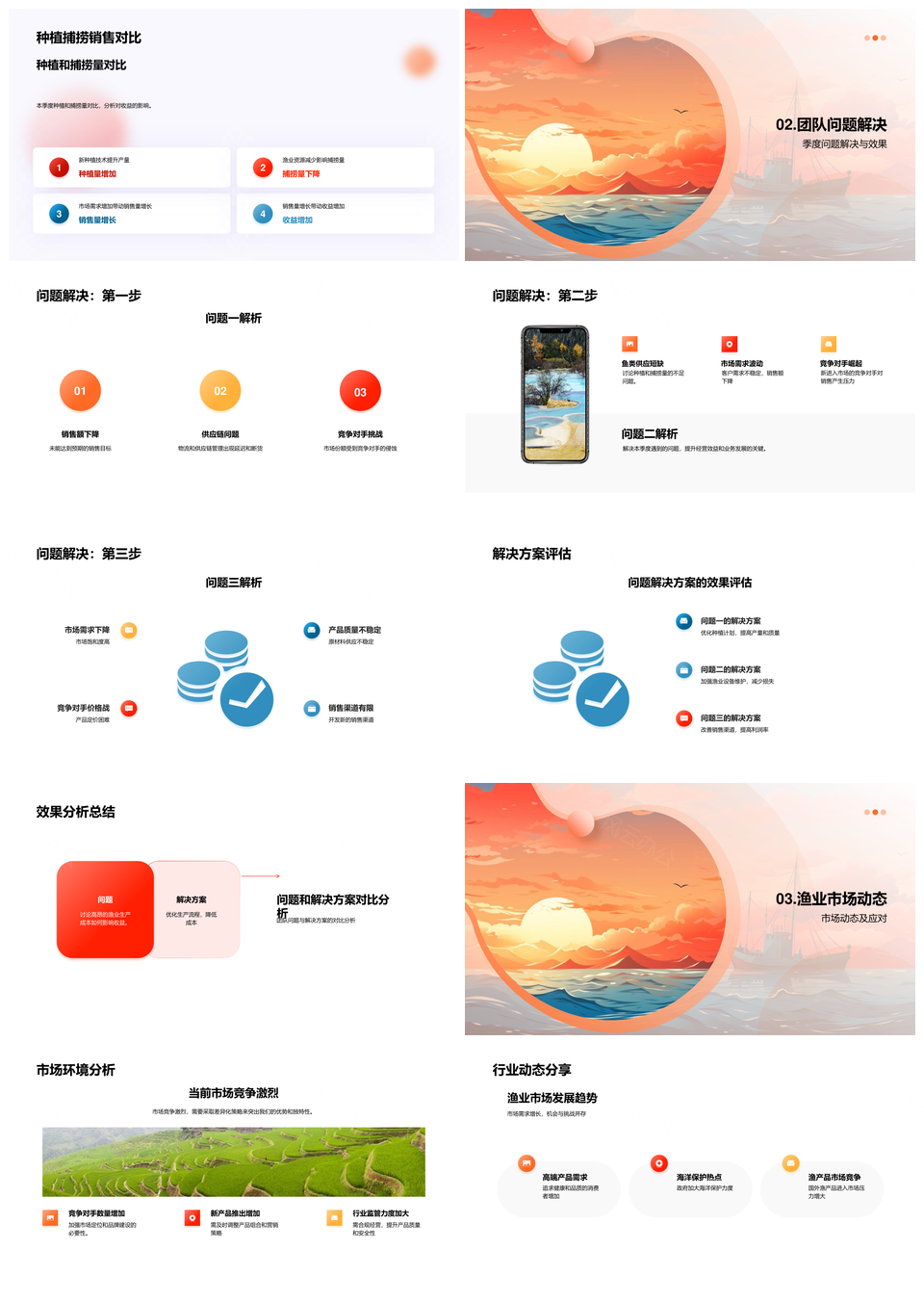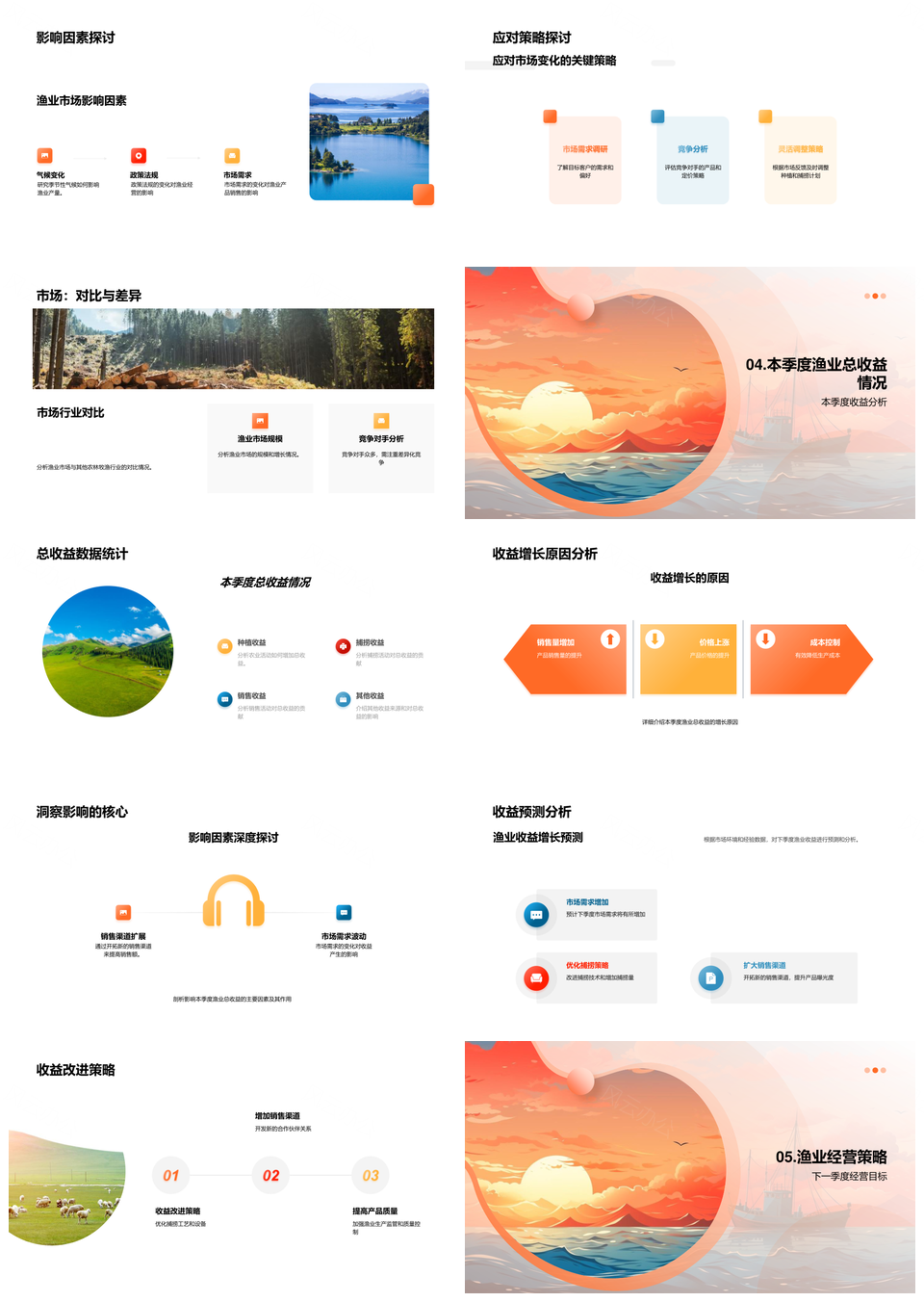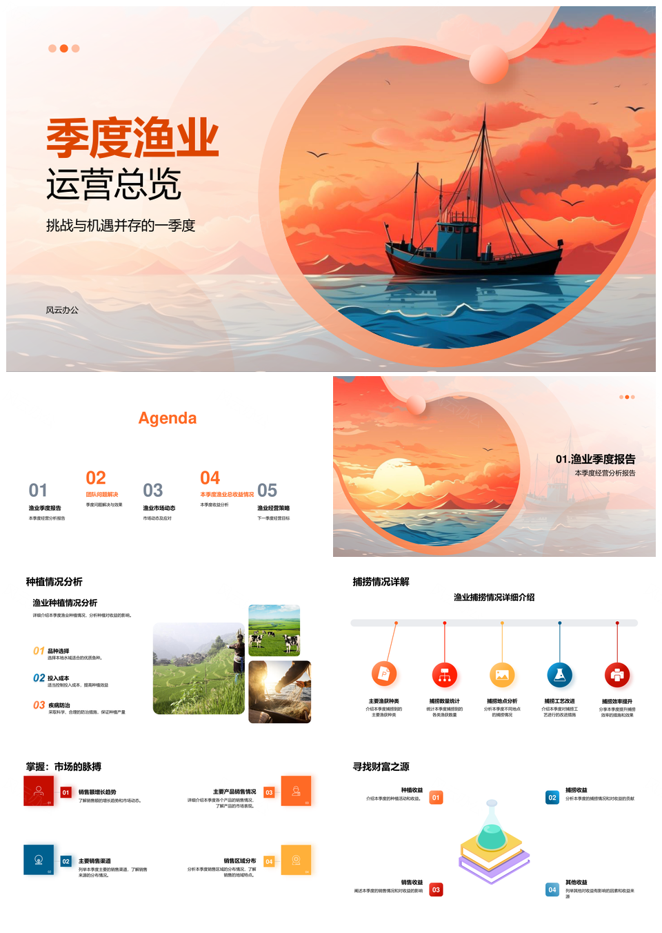 这是一张渔业季度运营收益种植捕捞销售动态分析PPT模板,包含渔业、季度、运营、收益、种植、捕捞、销售、分析等主题内容,也可用作渔业季度运营收益、季度运营收益种植、运营收益种植捕捞、收益种植捕捞销售、种植捕捞销售动态分析、渔业季度运营、季度运营收益、运营收益种植、收益种植捕捞、种植捕捞销售、捕捞销售动态分析、渔业季度、季度运营、运营收益、种植捕捞、捕捞销售等PPT场景使用。 风云办公提供的渔业季度运营收益种植捕捞销售动态分析PPT模板,下载格式为pptx,一共33页,作品中文字及图均可以修改和编辑,图片更改请在作品中右键图片并更换,文字修改请直接点击文字进行修改。