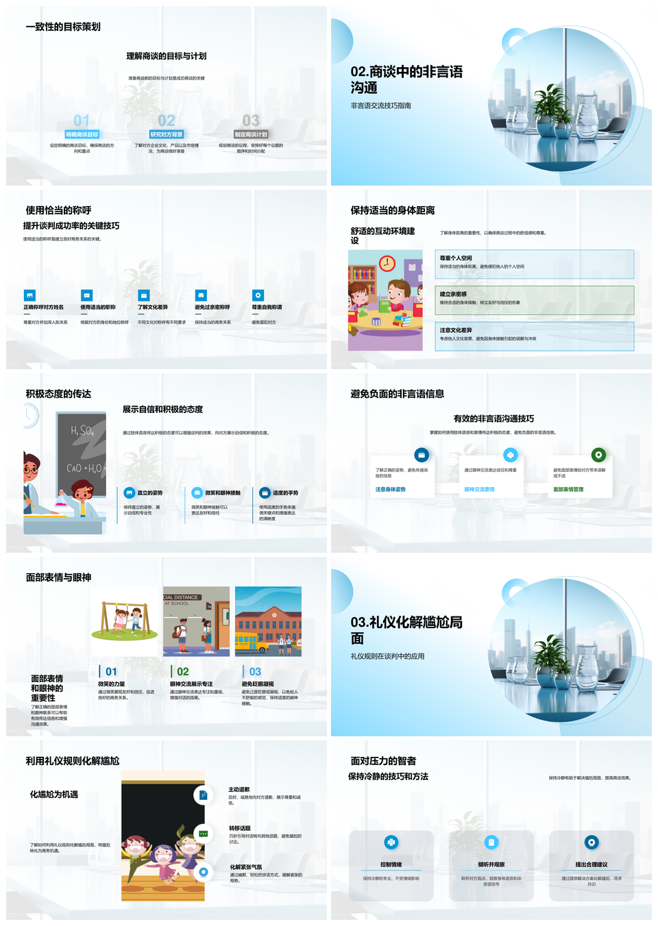 这是一张商务礼仪谈判力有效沟通商谈准备非言语PPT模板,包含商务礼仪、谈判力、有效沟通、商谈准备、非言语等主题内容,也可用作商务礼仪谈判力有效沟通商谈准备、谈判力有效沟通商谈准备非言语、商务礼仪有效沟通商谈准备非言语、商务礼仪谈判力有效沟通、有效沟通商谈准备非言语、商谈准备非言语、商务礼仪有效沟通、谈判力商谈准备、有效沟通非言语、商务礼仪谈判力、有效沟通商谈准备、谈判力有效沟通、商务礼仪商谈准备、谈判力非言语、商务礼仪非言语等PPT场景使用。 风云办公提供的商务礼仪谈判力有效沟通商谈准备非言语PPT模板,下载格式为pptx,一共33页,作品中文字及图均可以修改和编辑,图片更改请在作品中右键图片并更换,文字修改请直接点击文字进行修改。
