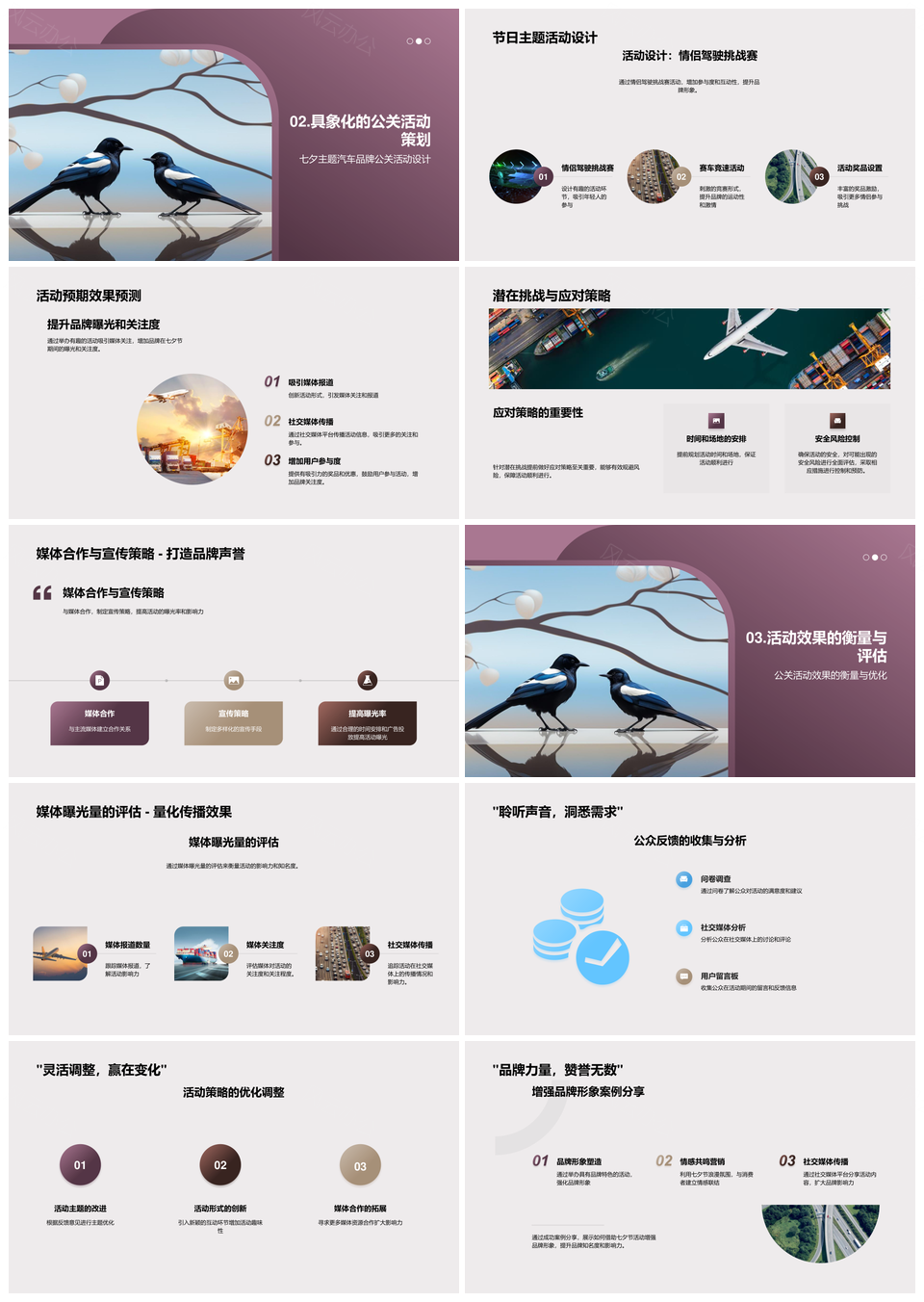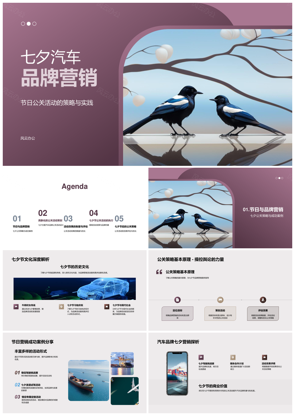 风云办公提供的七夕汽车品牌喜鹊情侣驾驶挑战赛PPT模板,下载格式为pptx,一共28页,作品中文字及图均可以修改和编辑,图片更改请在作品中右键图片并更换,文字修改请直接点击文字进行修改。