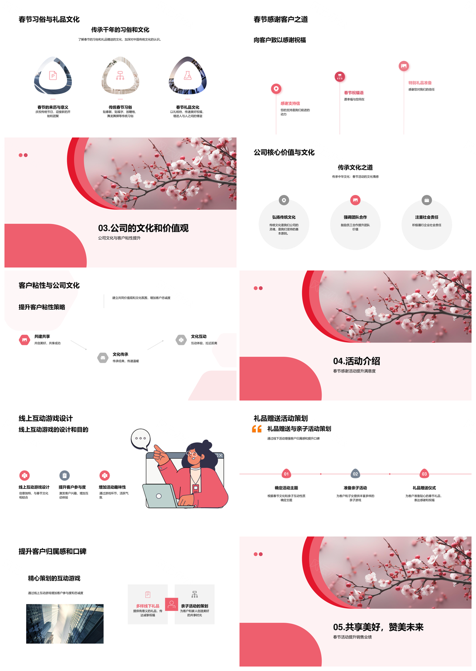 这是一张房地产春节感恩活动提升客户粘性双线促购樱花开运PPT模板,包含房地产、春节、感恩活动、提升、客户粘性、双线、促购、樱花、开运等主题内容,也可用作房地产春节感恩活动、春节感恩活动提升、感恩活动提升客户、活动提升客户粘性、提升客户粘性双线、客户粘性双线促购、双线促购樱花开运、房地产双线促购、春节双线促购樱花、感恩活动客户粘性、提升客户促购樱花、樱花开运房地产、春节樱花感恩、房地产春节促购、双线促购樱花等PPT场景使用。 风云办公提供的房地产春节感恩活动提升客户粘性双线促购樱花开运PPT模板,下载格式为pptx,一共21页,作品中文字及图均可以修改和编辑,图片更改请在作品中右键图片并更换,文字修改请直接点击文字进行修改。