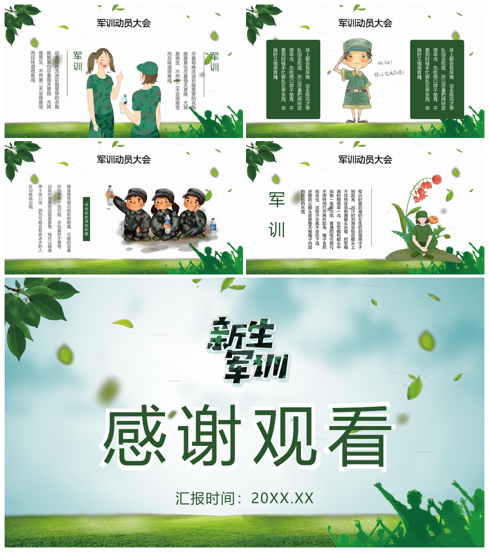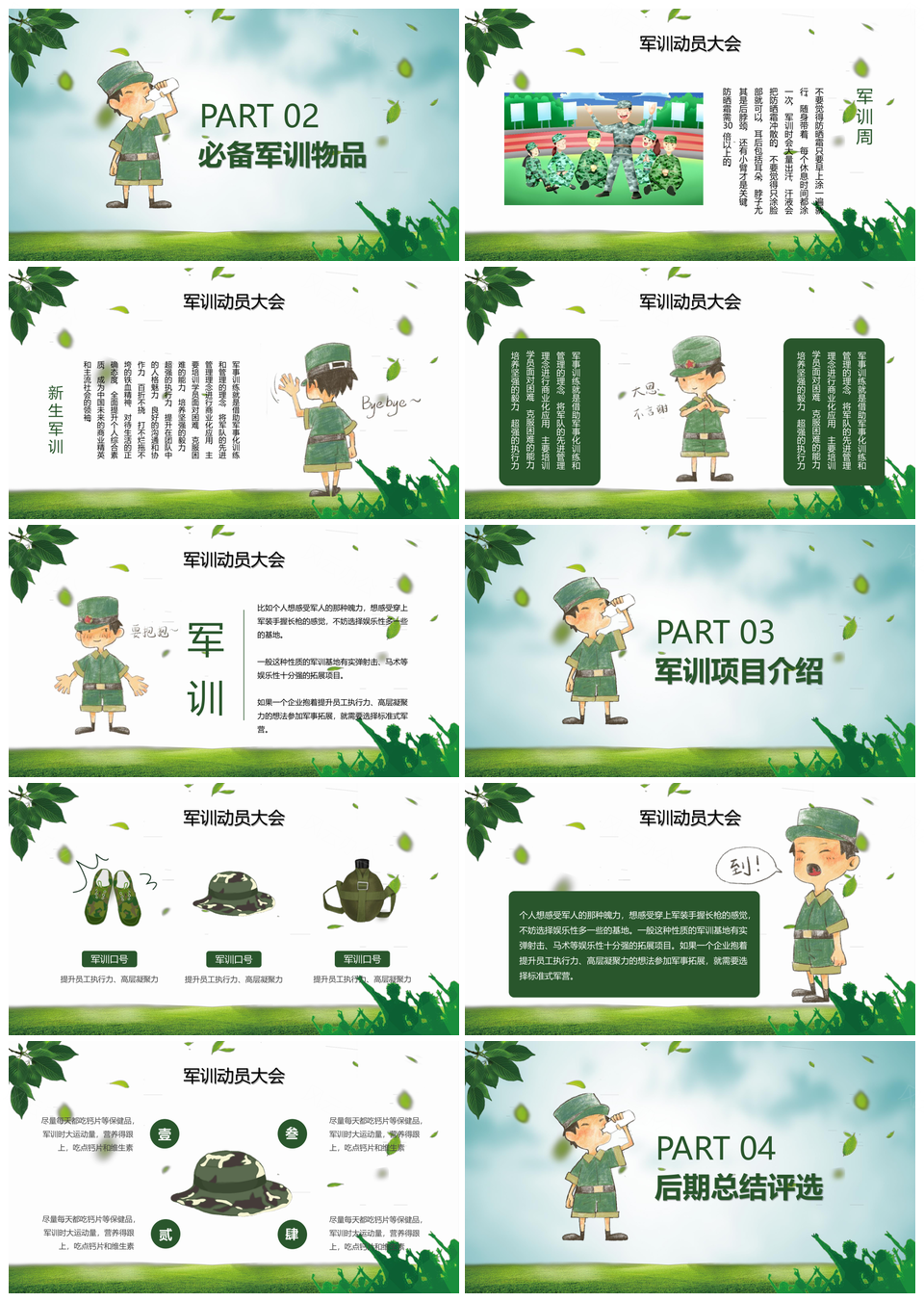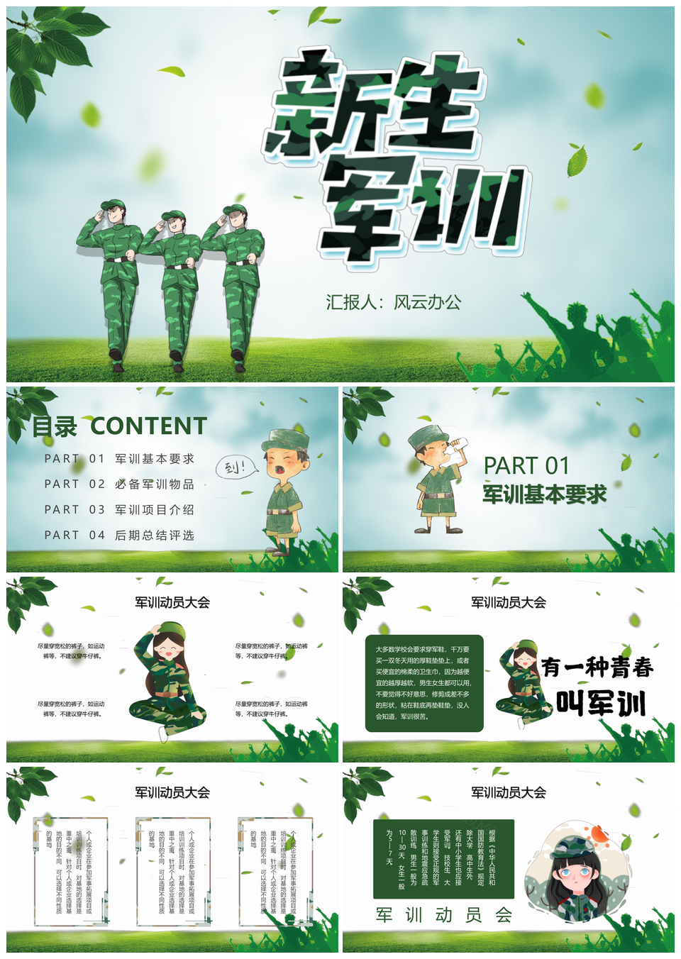 这是一张绿色清新新生军训PPT模板,包含绿色、清新、新生、军训等主题内容,也可用作绿色、清新、新生、军训 绿色清新新生军训、绿色清新新生、绿色清新军训、清新新生军训、绿色新生军训、绿色清新、清新新生、新生军训等PPT场景使用。 风云办公提供的绿色清新新生军训PPT模板,下载格式为pptx,一共22页,作品中文字及图均可以修改和编辑,图片更改请在作品中右键图片并更换,文字修改请直接点击文字进行修改。