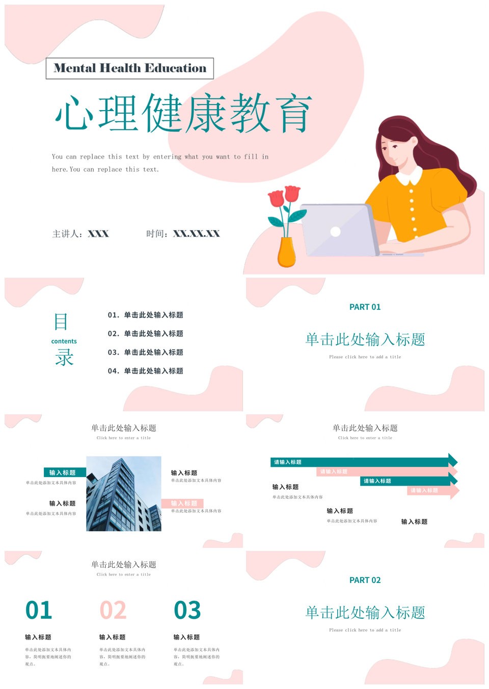 粉色创意插画心理健康抗压情绪调节教育PPT模板