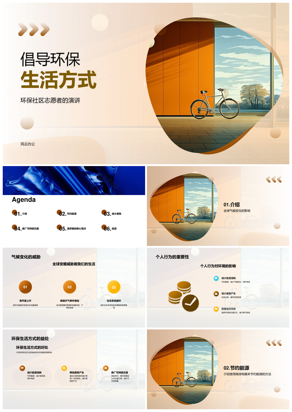 风云办公提供的社区志愿者倡导居民节能减废骑行环保PPT模板,下载格式为pptx,一共27页,作品中文字及图均可以修改和编辑,图片更改请在作品中右键图片并更换,文字修改请直接点击文字进行修改。