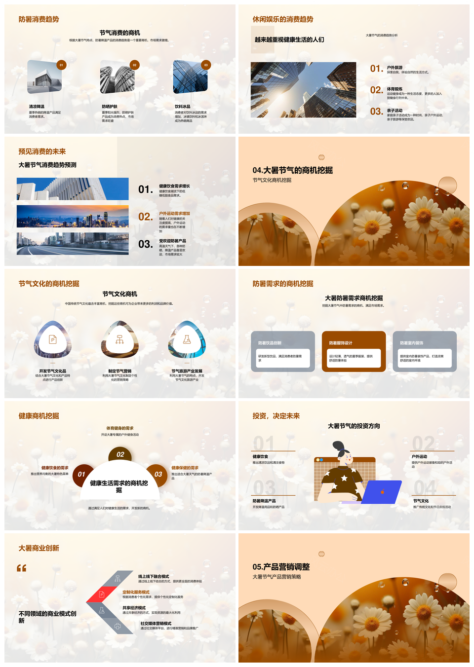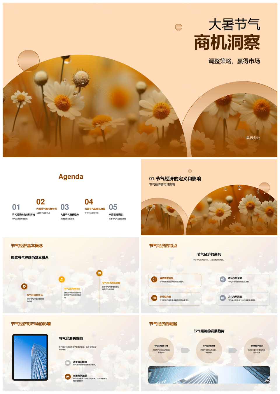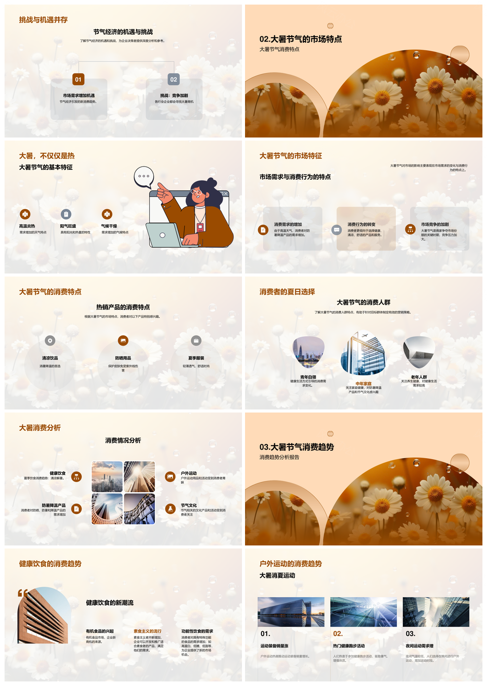 风云办公提供的大暑节气经济健康户外消费趋势商机PPT模板,下载格式为pptx,一共33页,作品中文字及图均可以修改和编辑,图片更改请在作品中右键图片并更换,文字修改请直接点击文字进行修改。