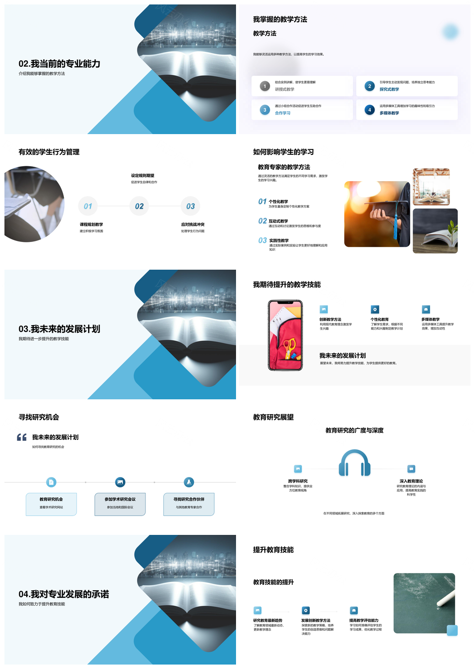 风云办公提供的教育专业成长求职研讨教学技能提升PPT模板,下载格式为pptx,一共24页,作品中文字及图均可以修改和编辑,图片更改请在作品中右键图片并更换,文字修改请直接点击文字进行修改。