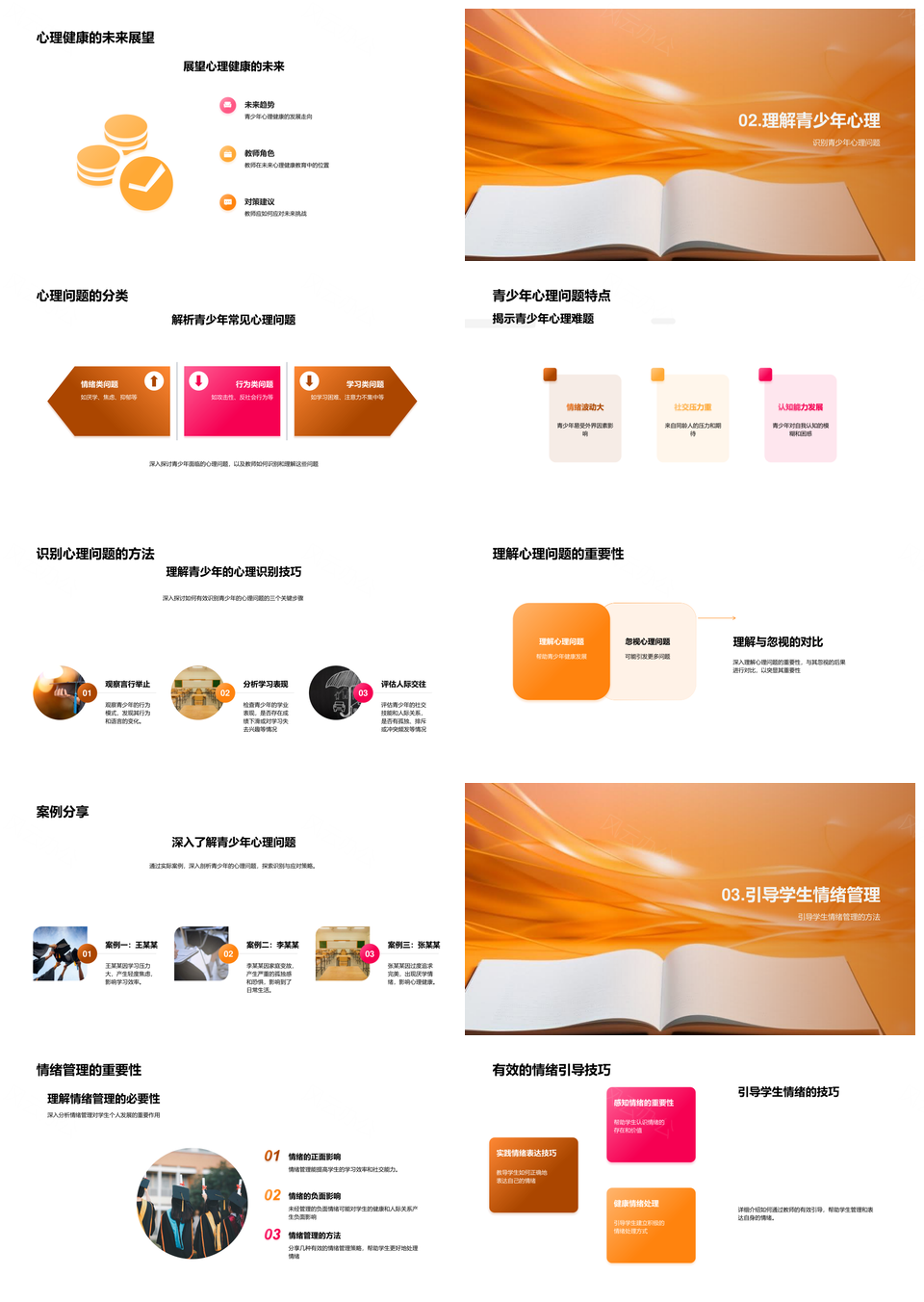 风云办公提供的青少年心理健康教师引导教育问题管理PPT模板,下载格式为pptx,一共33页,作品中文字及图均可以修改和编辑,图片更改请在作品中右键图片并更换,文字修改请直接点击文字进行修改。