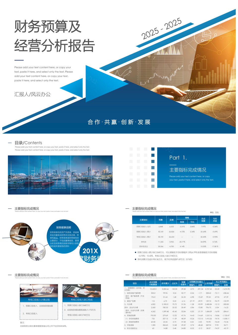 风云办公提供的2025财务预算及经营分析报告PPT模板,下载格式为pptx,一共31页,作品中文字及图均可以修改和编辑,图片更改请在作品中右键图片并更换,文字修改请直接点击文字进行修改。