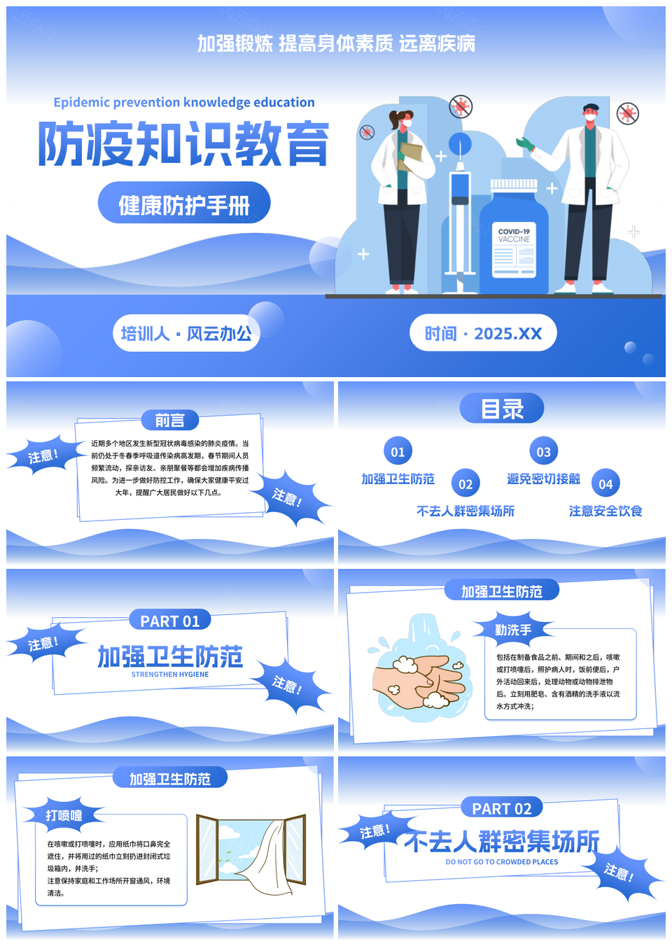 风云办公提供的2025医学防疫知识卡通教育讲座PPT模板,下载格式为pptx,一共15页,作品中文字及图均可以修改和编辑,图片更改请在作品中右键图片并更换,文字修改请直接点击文字进行修改。