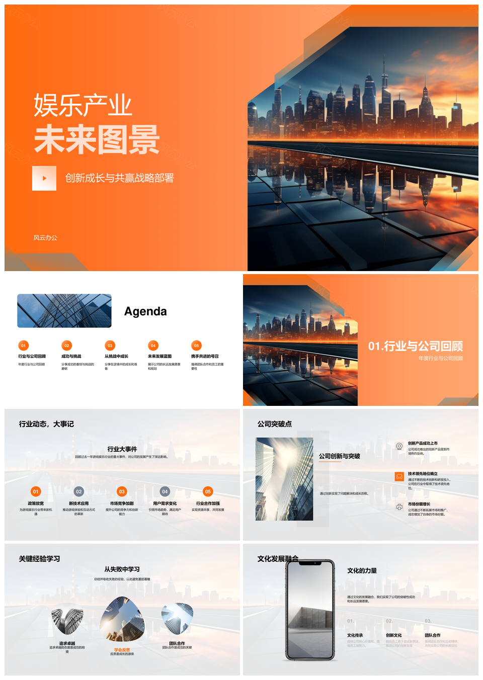 风云办公提供的娱乐产业创新破局共赢未来城市新景PPT模板,下载格式为pptx,一共28页,作品中文字及图均可以修改和编辑,图片更改请在作品中右键图片并更换,文字修改请直接点击文字进行修改。