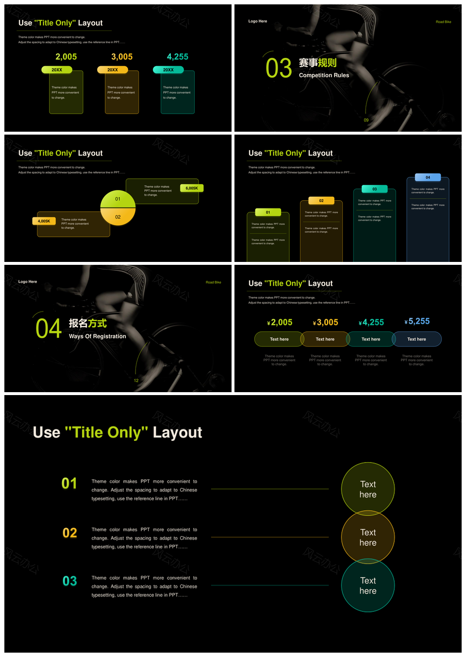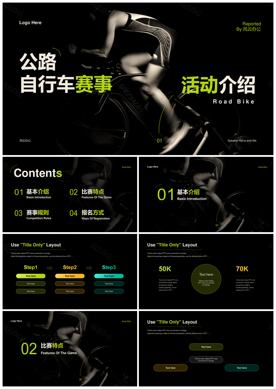 风云办公提供的黑色商务公路自行车竞技赛事活动培训比赛课件,下载格式为pptx,一共15页,作品中文字及图均可以修改和编辑,图片更改请在作品中右键图片并更换,文字修改请直接点击文字进行修改。