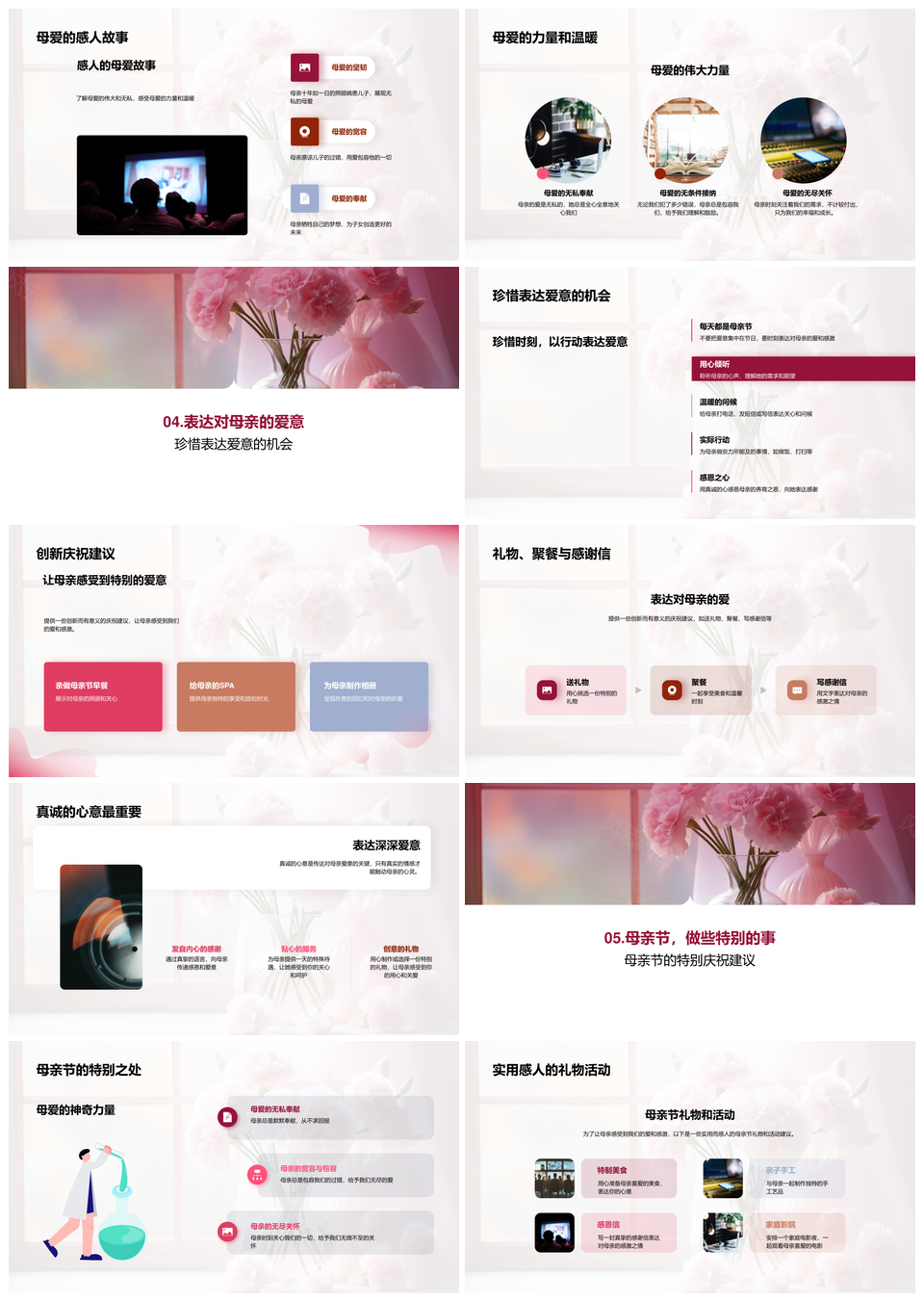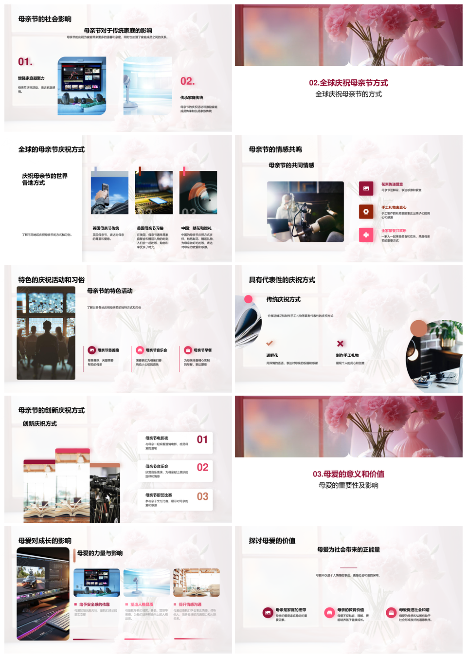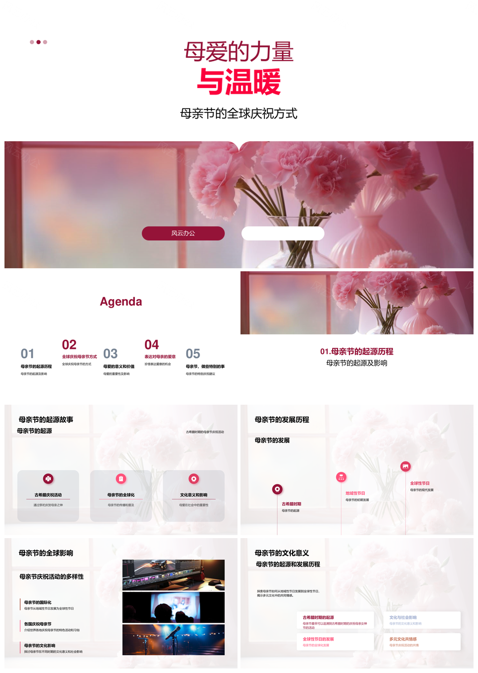 这是一张母爱永恒母亲节起源温情康乃馨创意致敬PPT模板,包含母爱、永恒、母亲节、起源、温情、康乃馨、创意、致敬等主题内容,也可用作母爱永恒母亲节起源、母亲节起源温情康乃馨、母亲节起源康乃馨创意、母爱永恒母亲节温情、康乃馨创意致敬母爱、温情康乃馨创意致敬、母亲节温情康乃馨创意、母爱永恒母亲节创意、母爱永恒温情康乃馨、母亲节康乃馨创意致敬、母爱永恒康乃馨创意、永恒母亲节康乃馨、温情康乃馨创意、母爱永恒母亲节、母亲节起源康乃馨、康乃馨创意致敬等PPT场景使用。 风云办公提供的母爱永恒母亲节起源温情康乃馨创意致敬PPT模板,下载格式为pptx,一共30页,作品中文字及图均可以修改和编辑,图片更改请在作品中右键图片并更换,文字修改请直接点击文字进行修改。