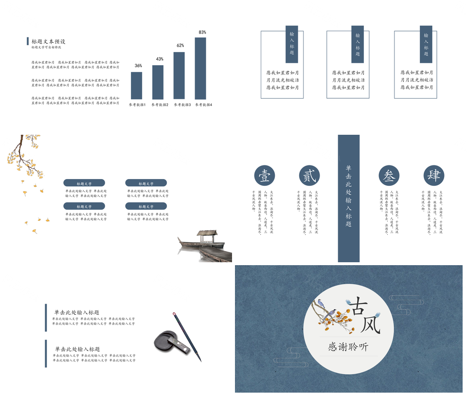 这是一张灰色蓝色复古中国风PPT模板,包含灰色、蓝色、复古、中国风等主题内容,也可用作灰色蓝色复古中国风、灰色蓝色复古、灰色蓝色中国风、灰色复古中国风、蓝色复古中国风、灰色蓝色、灰色复古、灰色中国风、蓝色复古、蓝色中国风、复古中国风等PPT场景使用。 风云办公提供的灰色蓝色复古中国风PPT模板,下载格式为pptx,一共33页,作品中文字及图均可以修改和编辑,图片更改请在作品中右键图片并更换,文字修改请直接点击文字进行修改。