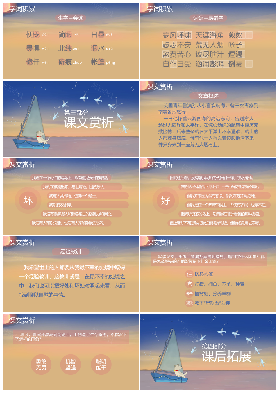 这是一张人教版小学语文六年级课件鲁滨孙漂流记PPT模板,包含人教版、小学语文、六年级、课件、鲁滨孙漂流记等主题内容,也可用作人教版、小学、语文、六年级、课件、鲁滨孙、漂流记 人教版小学语文六年级、小学语文六年级课件、语文六年级课件鲁滨孙、六年级课件鲁滨孙漂流记、人教版小学语文课件、小学语文鲁滨孙漂流记、六年级课件鲁滨孙、语文课件鲁滨孙漂流记、人教版鲁滨孙漂流记、小学六年级课件漂流记、语文六年级鲁滨孙、课件漂流记等PPT场景使用。 风云办公提供的人教版小学语文六年级课件鲁滨孙漂流记PPT模板,下载格式为pptx,一共24页,作品中文字及图均可以修改和编辑,图片更改请在作品中右键图片并更换,文字修改请直接点击文字进行修改。