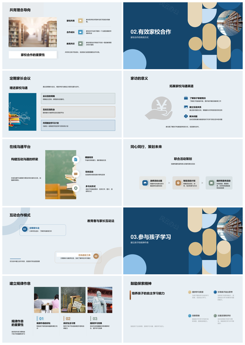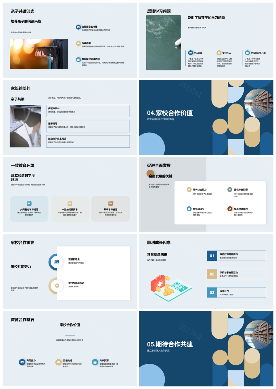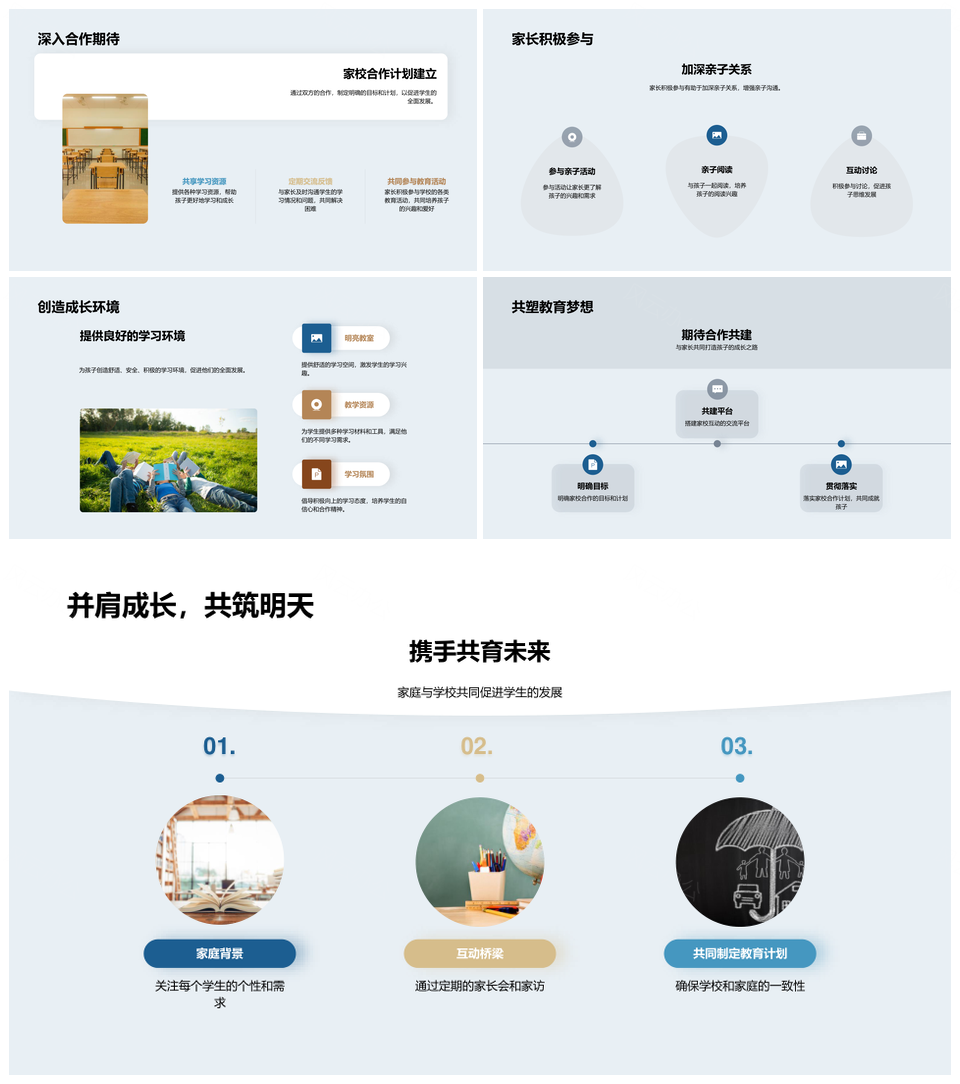 这是一张家校家庭互动合作共育共成长建学习环境PPT模板,包含家校、家庭、互动、合作、共育、共成长、学习环境等主题内容,也可用作家校合作共育共成长、家庭互动合作共育、互动合作共育共成长、家校合作共育、家庭互动合作、互动合作共育、合作共育共成长、共育共成长学习环境、家校共育共成长、家庭共育共成长、家校合作、家庭互动、互动合作、合作共育、共育共成长等PPT场景使用。 风云办公提供的家校家庭互动合作共育共成长建学习环境PPT模板,下载格式为pptx,一共33页,作品中文字及图均可以修改和编辑,图片更改请在作品中右键图片并更换,文字修改请直接点击文字进行修改。