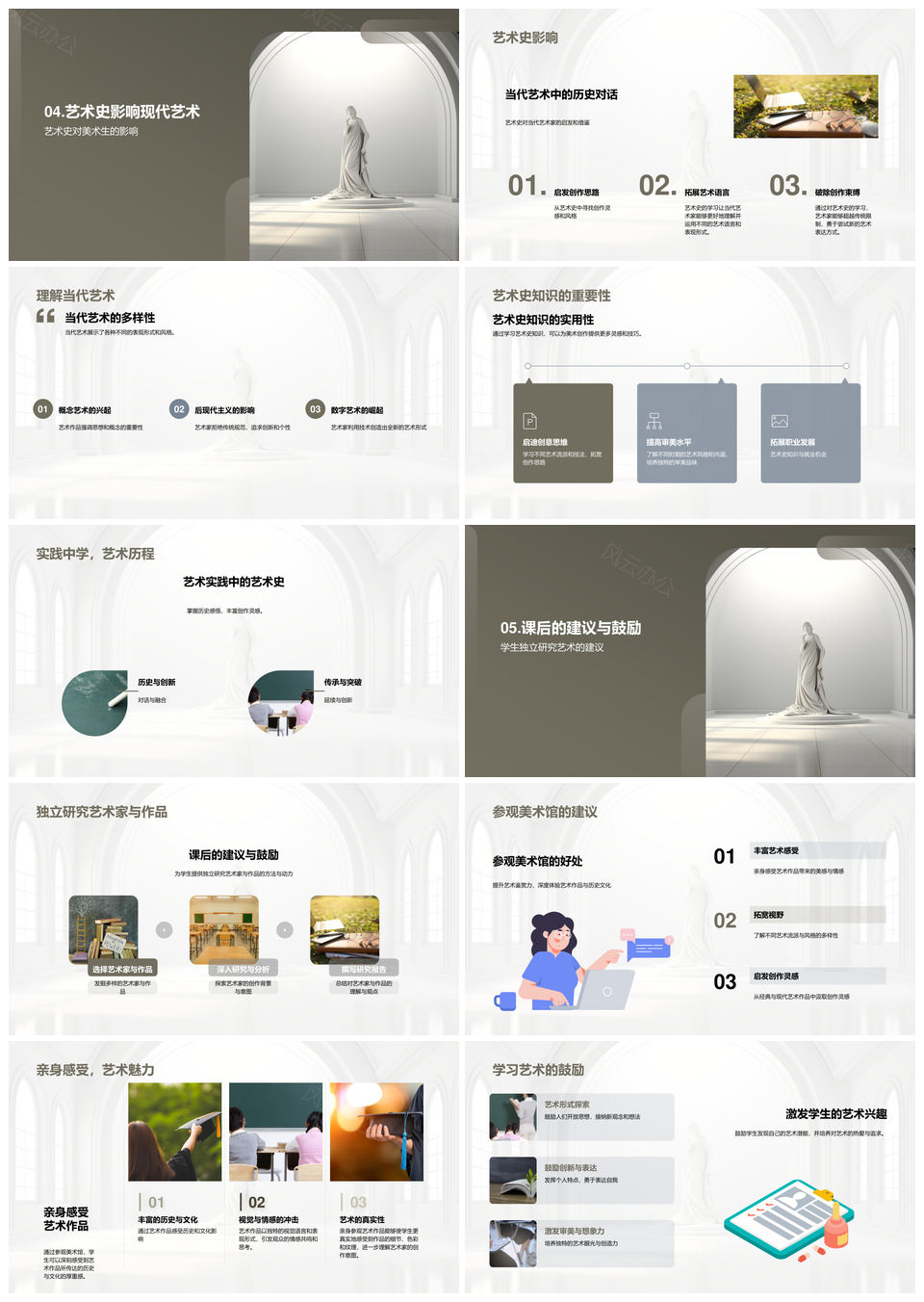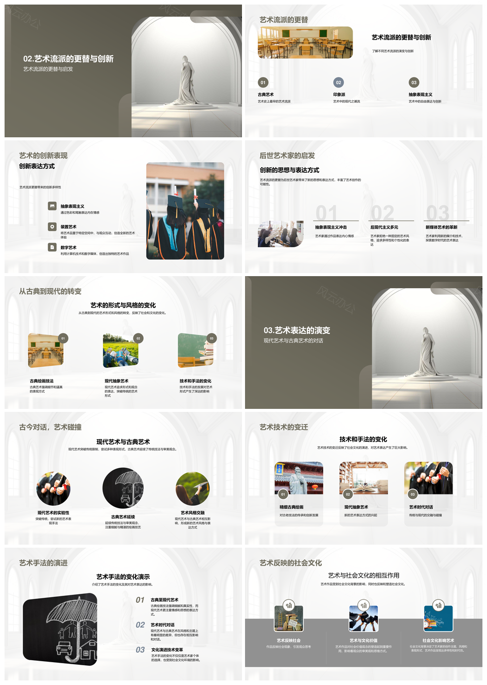 风云办公提供的艺术史演进古典当代社会技术艺教创新PPT模板,下载格式为pptx,一共28页,作品中文字及图均可以修改和编辑,图片更改请在作品中右键图片并更换,文字修改请直接点击文字进行修改。