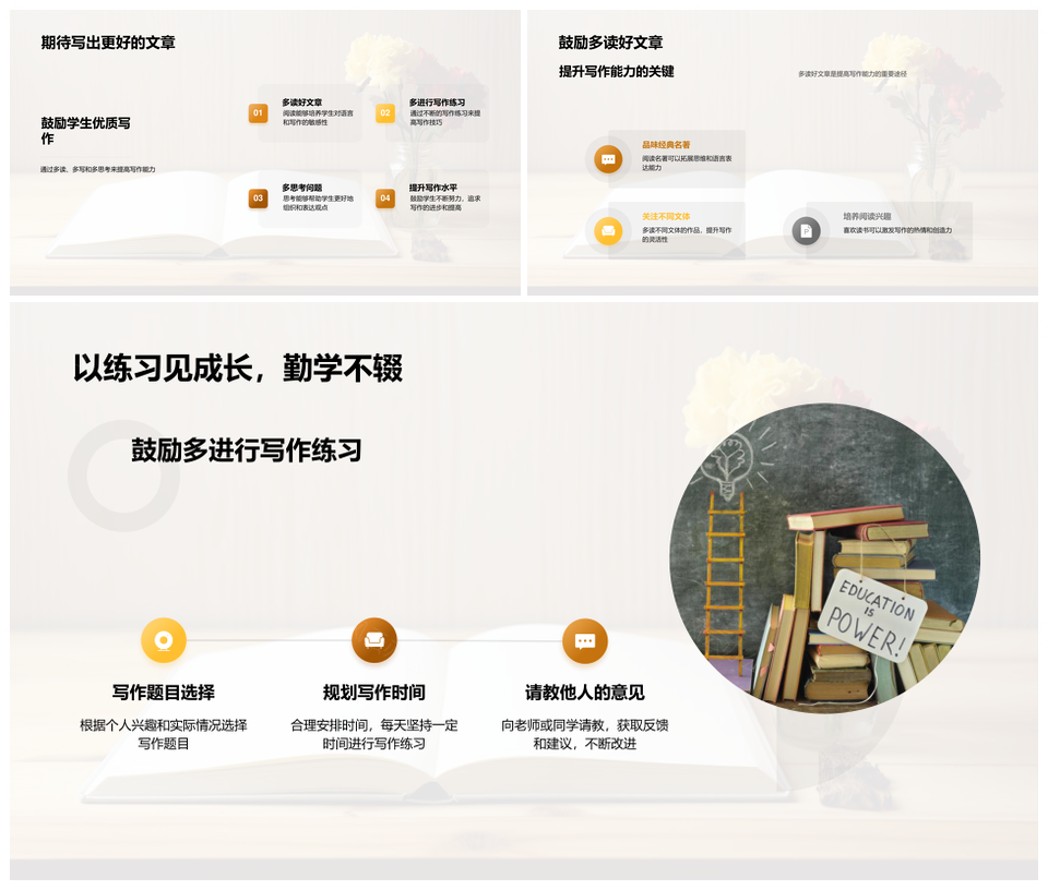 这是一张写作技巧练习思考阅读润色指南PPT模板,包含写作技巧、练习、思考、阅读、润色、指南等主题内容,也可用作写作技巧练习思考、写作技巧练习阅读、写作技巧练习润色、写作技巧思考阅读、写作技巧思考润色、写作技巧阅读润色、写作技巧润色指南、写作练习思考阅读、写作练习阅读润色、练习思考阅读润色、思考阅读润色指南、写作技巧练习、写作技巧思考、写作技巧阅读、写作技巧润色等PPT场景使用。