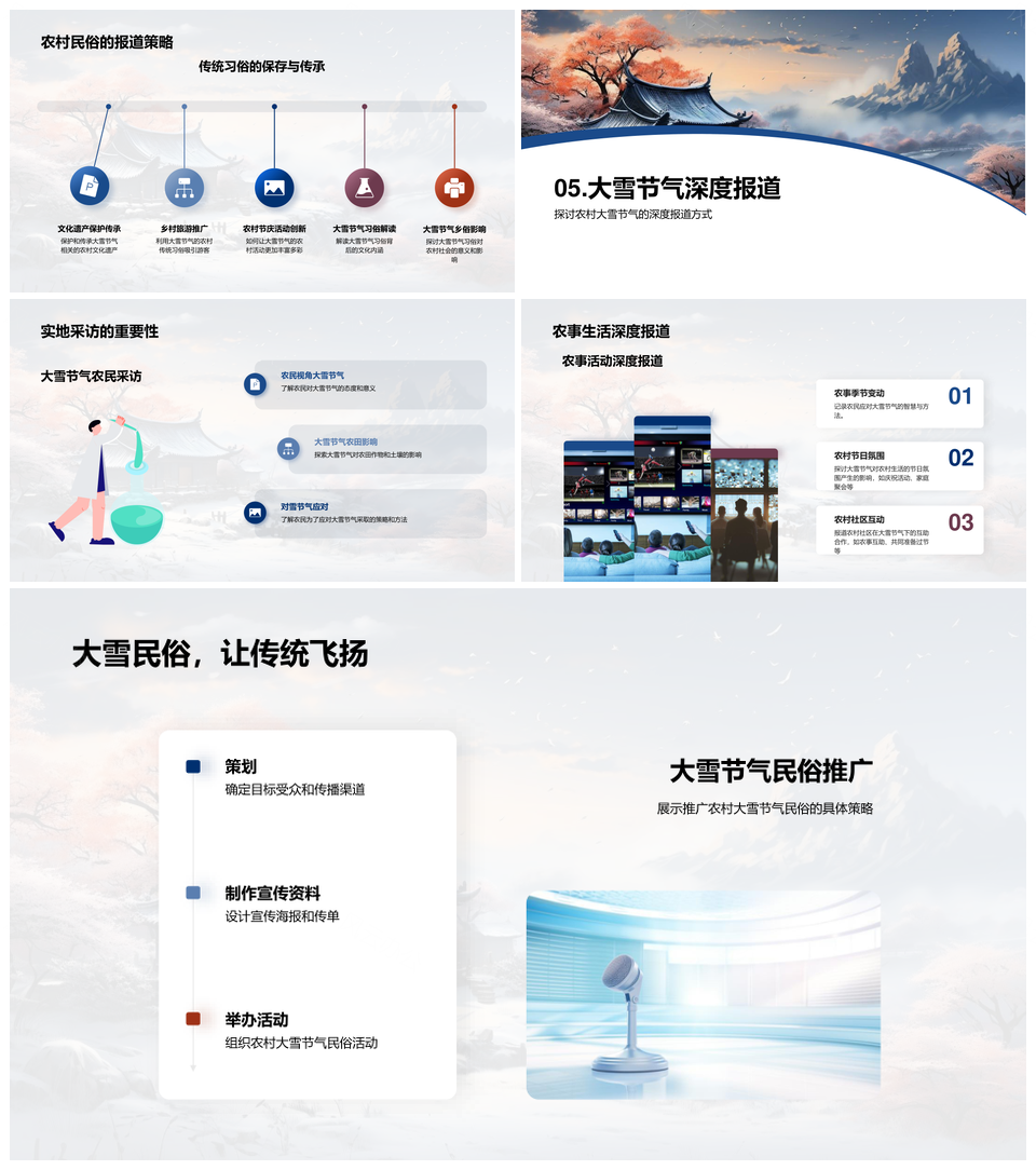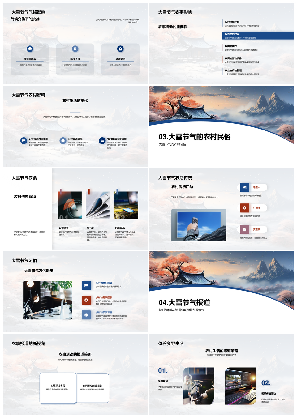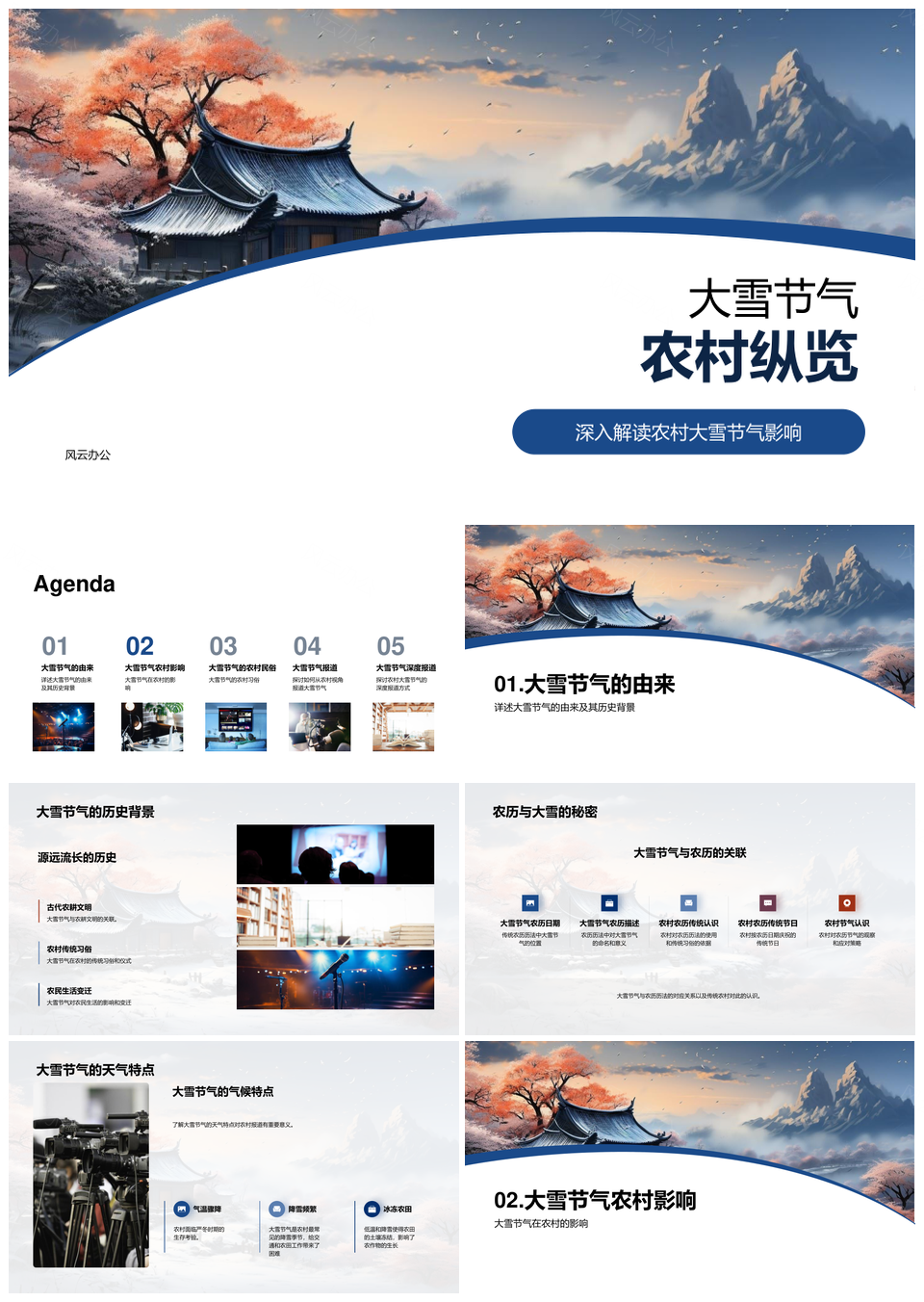 风云办公提供的大雪节气农村历史农历气候农事雪景PPT模板,下载格式为pptx,一共23页,作品中文字及图均可以修改和编辑,图片更改请在作品中右键图片并更换,文字修改请直接点击文字进行修改。