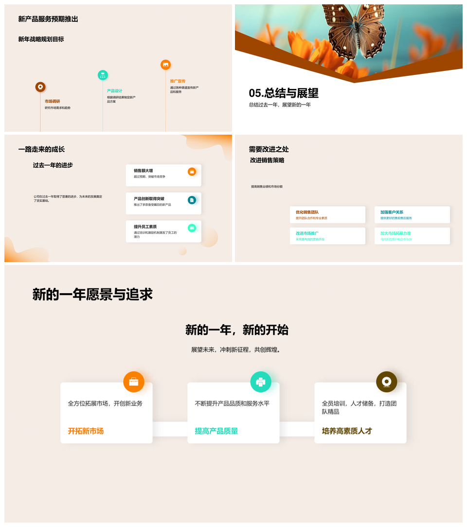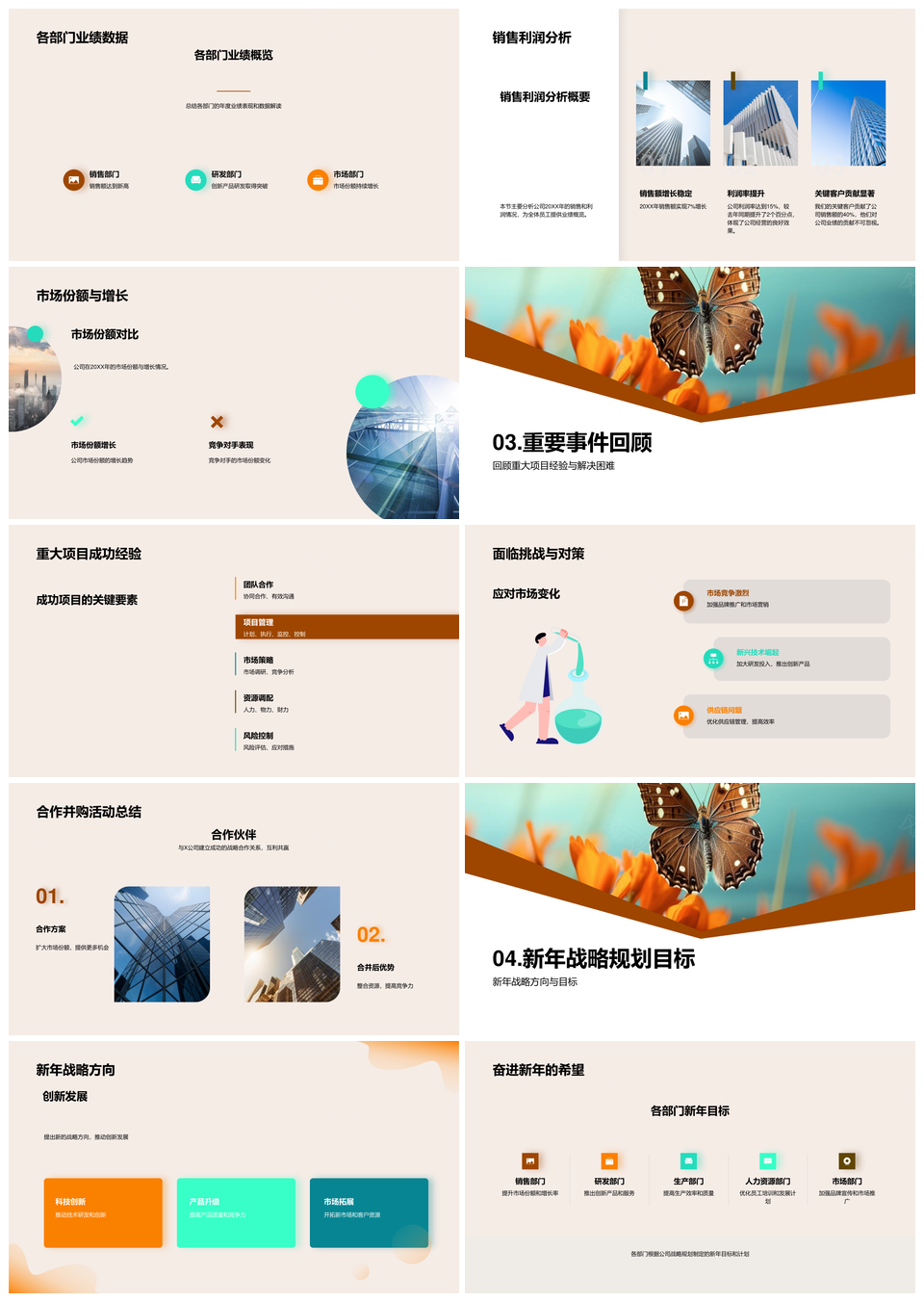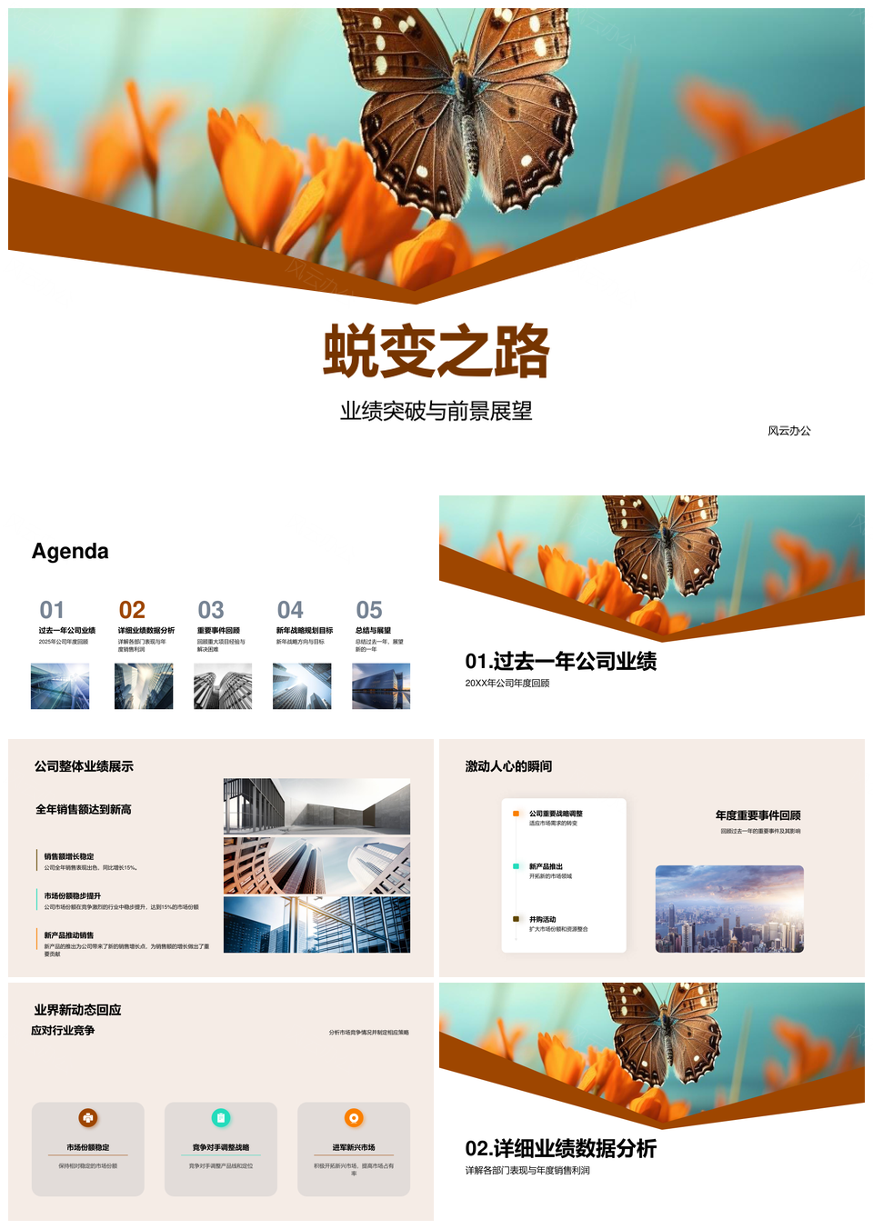 这是一张2025蜕变化蝶公司业绩突破利润份额增长展望PPT模板,包含2025、蜕变化蝶、公司、业绩、突破、利润、份额、增长、展望等主题内容,也可用作2025蜕变化蝶公司业绩突破、蜕变化蝶公司业绩突破利润、公司业绩突破利润份额、业绩突破利润份额增长、突破利润份额增长展望、蜕变化蝶公司业绩突破、公司业绩突破利润、业绩突破利润份额、突破利润份额增长、利润份额增长展望、蜕变化蝶公司业绩、公司业绩突破、业绩突破利润、突破利润份额、利润份额增长等PPT场景使用。 风云办公提供的2025蜕变化蝶公司业绩突破利润份额增长展望PPT模板,下载格式为pptx,一共23页,作品中文字及图均可以修改和编辑,图片更改请在作品中右键图片并更换,文字修改请直接点击文字进行修改。