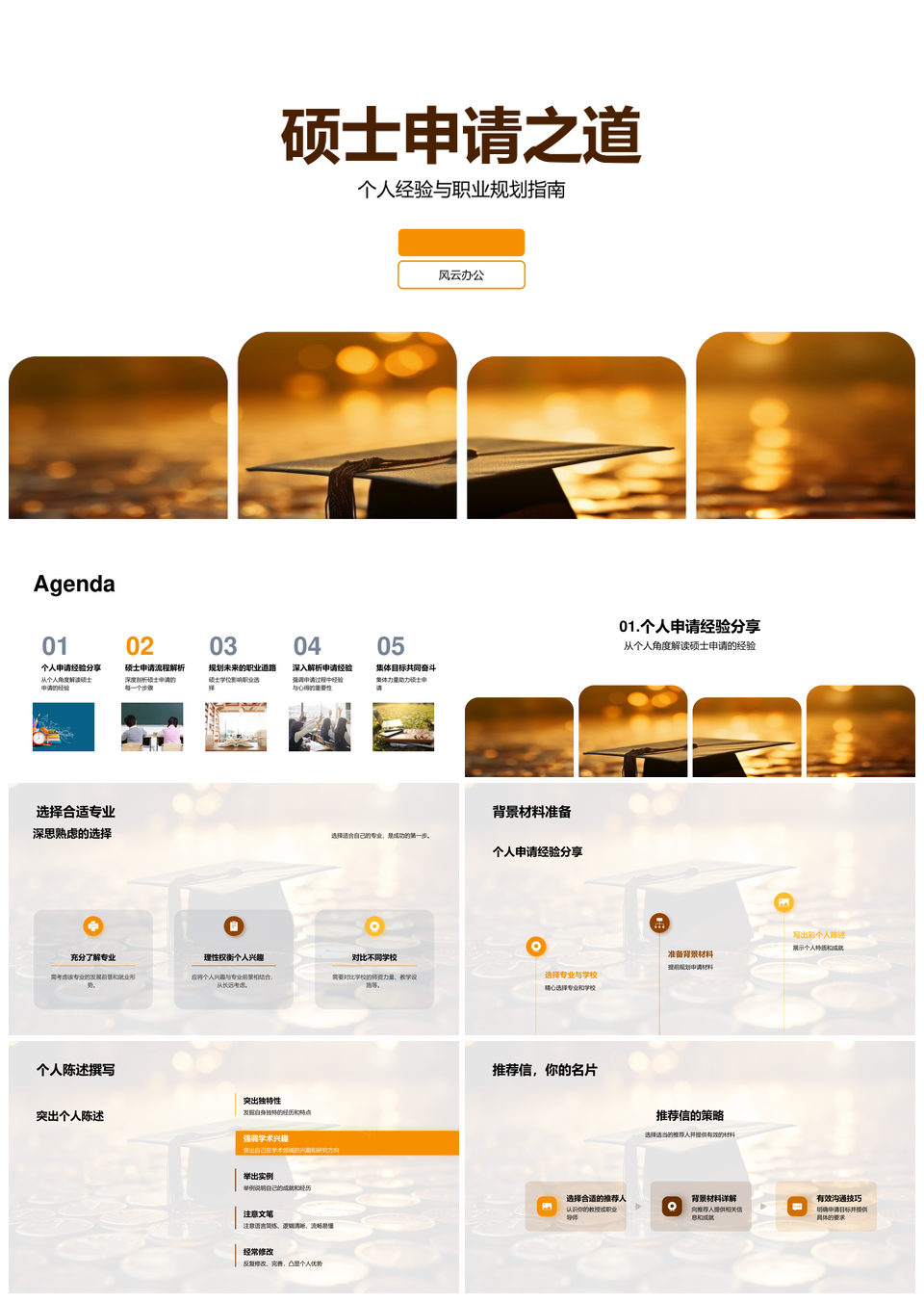 风云办公提供的硕士申请经验职业规划毕业帽指南PPT模板,下载格式为pptx,一共33页,作品中文字及图均可以修改和编辑,图片更改请在作品中右键图片并更换,文字修改请直接点击文字进行修改。