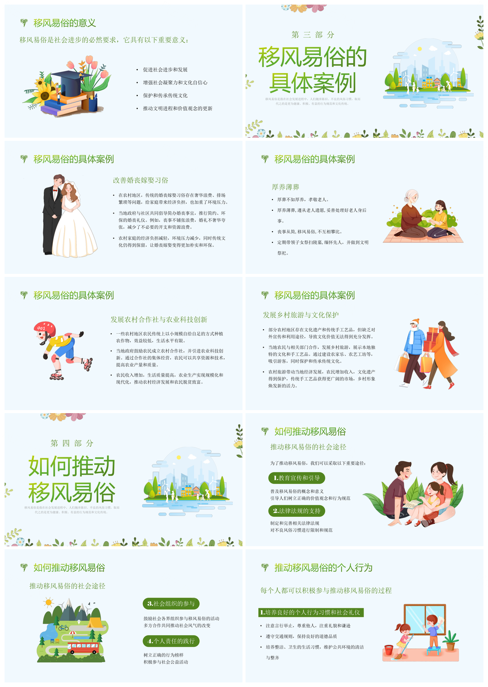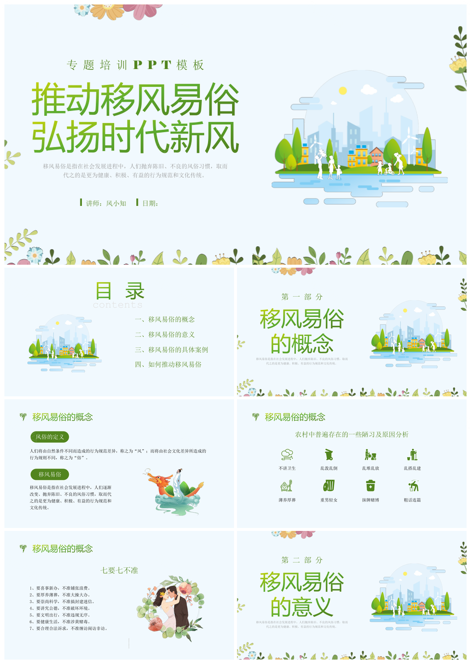 风云办公提供的绿色卡通移风易俗新风主题宣讲课件,下载格式为pptx,一共21页,作品中文字及图均可以修改和编辑,图片更改请在作品中右键图片并更换,文字修改请直接点击文字进行修改。