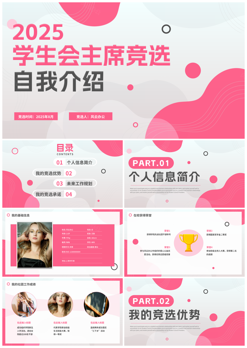 这是一张2025粉红渐变时尚学生会干部竞选自我介绍面试PPT模板,包含2025、粉红、渐变、时尚、学生、会干部、竞选、自我介绍、面试等主题内容,也可用作粉红渐变时尚学生会、渐变时尚学生会干部、时尚学生会干部竞选、学生会干部竞选自我介绍、干部竞选自我介绍面试、粉红渐变时尚、渐变时尚学生会、时尚学生会干部、学生会干部竞选、干部竞选自我介绍、竞选自我介绍面试、粉红渐变、渐变时尚、时尚学生会、学生会干部等PPT场景使用。 风云办公提供的2025粉红渐变时尚学生会干部竞选自我介绍面试PPT模板,下载格式为pptx,一共18页,作品中文字及图均可以修改和编辑,图片更改请在作品中右键图片并更换,文字修改请直接点击文字进行修改。
