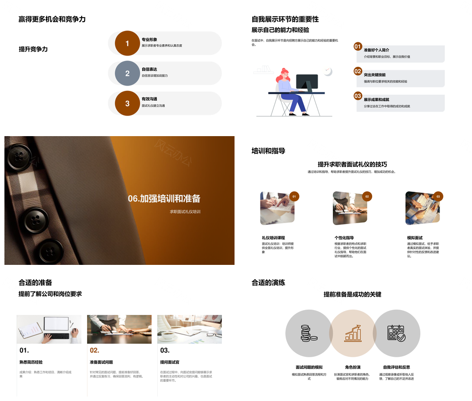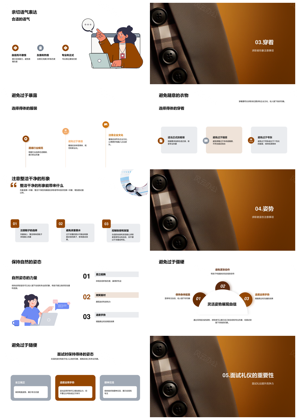 这是一张求职高效面试礼仪言行穿着姿势形象指南PPT模板,包含求职、高效、面试、礼仪、言行、穿着、姿势、形象、指南等主题内容,也可用作高效面试礼仪言行、面试礼仪言行穿着、礼仪言行穿着姿势、言行穿着姿势形象、求职高效面试、高效面试礼仪、面试礼仪言行、礼仪言行穿着、言行穿着姿势、穿着姿势形象、姿势形象指南、求职高效、高效面试、面试礼仪、礼仪言行等PPT场景使用。 风云办公提供的求职高效面试礼仪言行穿着姿势形象指南PPT模板,下载格式为pptx,一共24页,作品中文字及图均可以修改和编辑,图片更改请在作品中右键图片并更换,文字修改请直接点击文字进行修改。