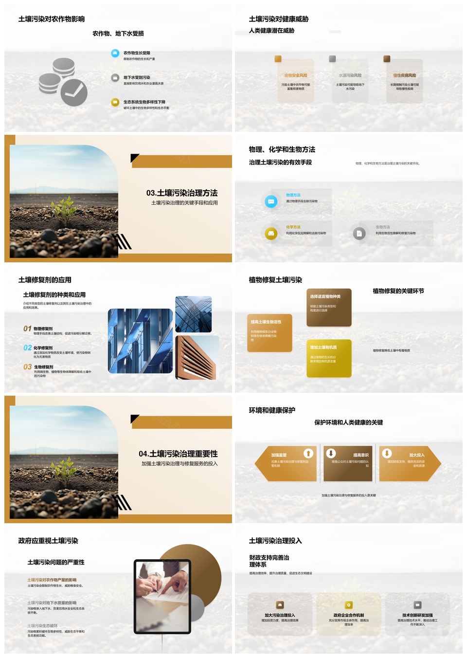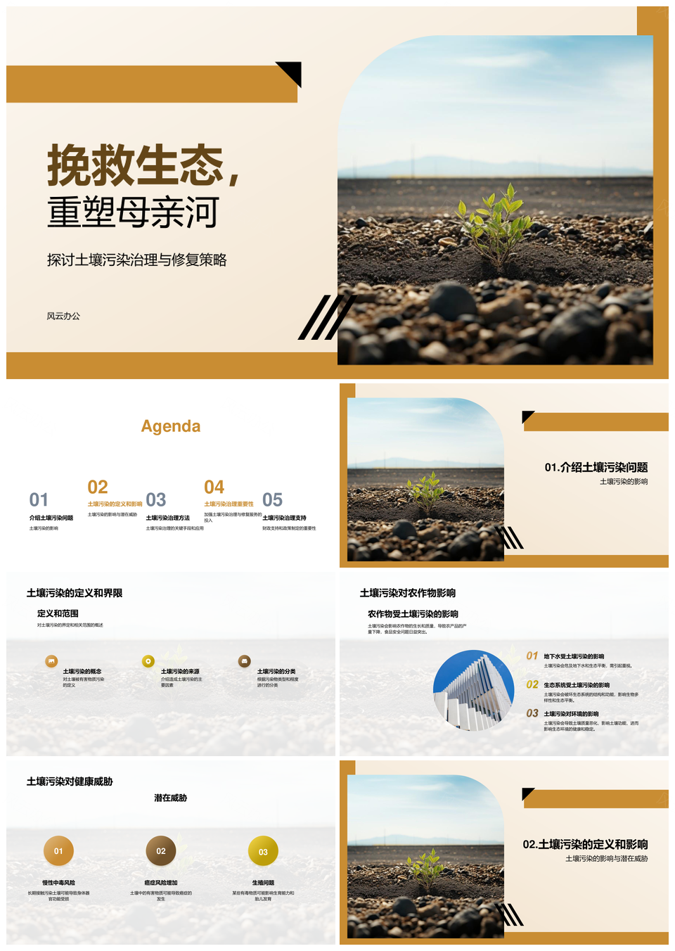 风云办公提供的土壤污染治理修复守护生态健康PPT模板,下载格式为pptx,一共22页,作品中文字及图均可以修改和编辑,图片更改请在作品中右键图片并更换,文字修改请直接点击文字进行修改。